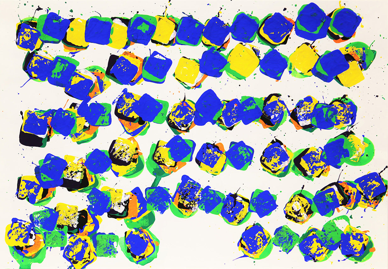 1996年生まれ 滋賀県在住 2015年から『やまなみ工房』に在籍 もともと創作活動に消極的だった彼が、気負いなく作業感覚で取り組める方法のひとつとして、スタンプ押しの活動が始まった。巻いて棒状にしたダンボール紙や紙コップ、ゴム判子等、様々な素材の判子を用いて自分の好きな色を決めて、判子を一つ一つ確実に丁寧に押してゆく。取り組む中で徐々に創作に対する苦手意識から解放され、作品が完成するたびにやりがいや喜び、そして彼の中で創作に対する自信が深まった。 今では内向的な彼が自己表現の一つとして取り組める活動となる。