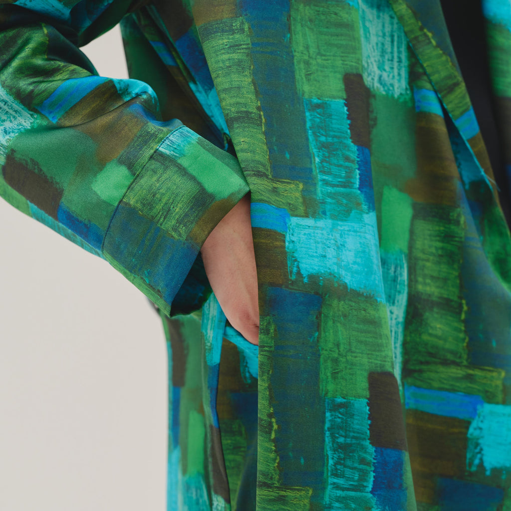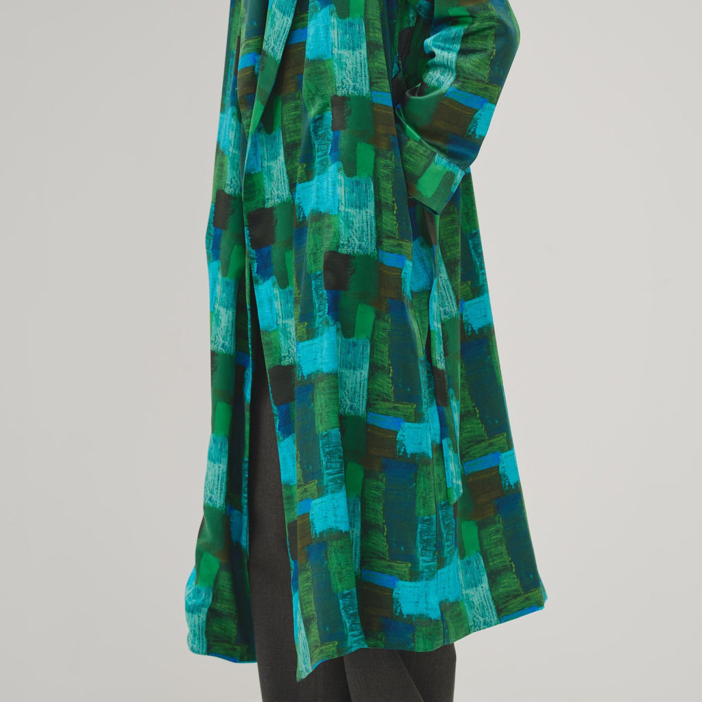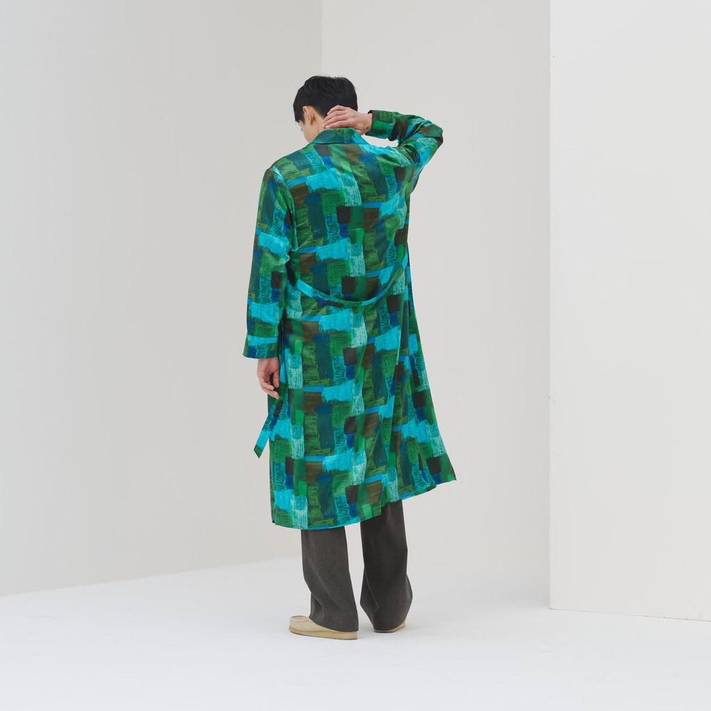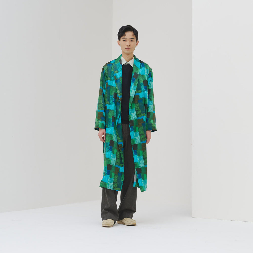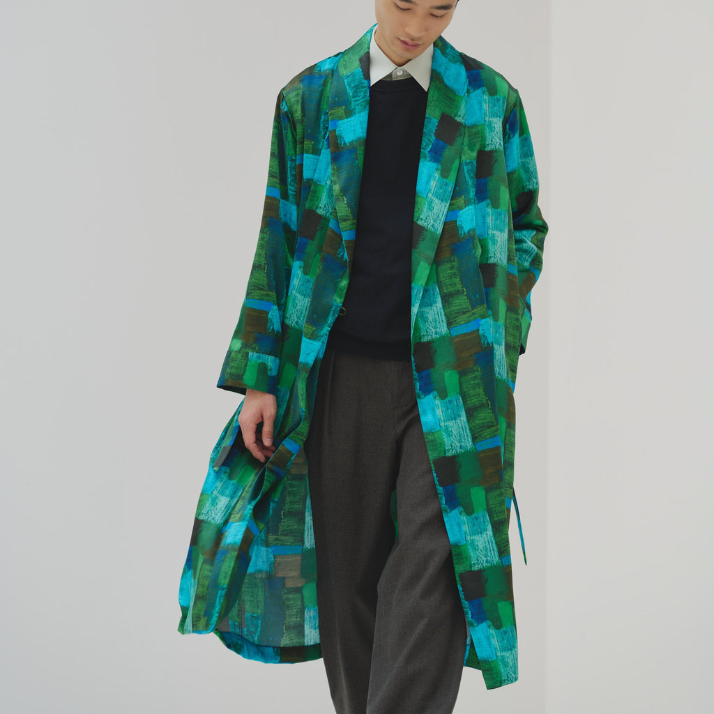 ワンピースとしても、羽織りとしても着られる、リラックス感あふれるガウンコート。レイヤードによって冬から春まで活躍する一枚です。同じアートを起用したサーキュラープリーツスカートとのセットアップもおすすめです。