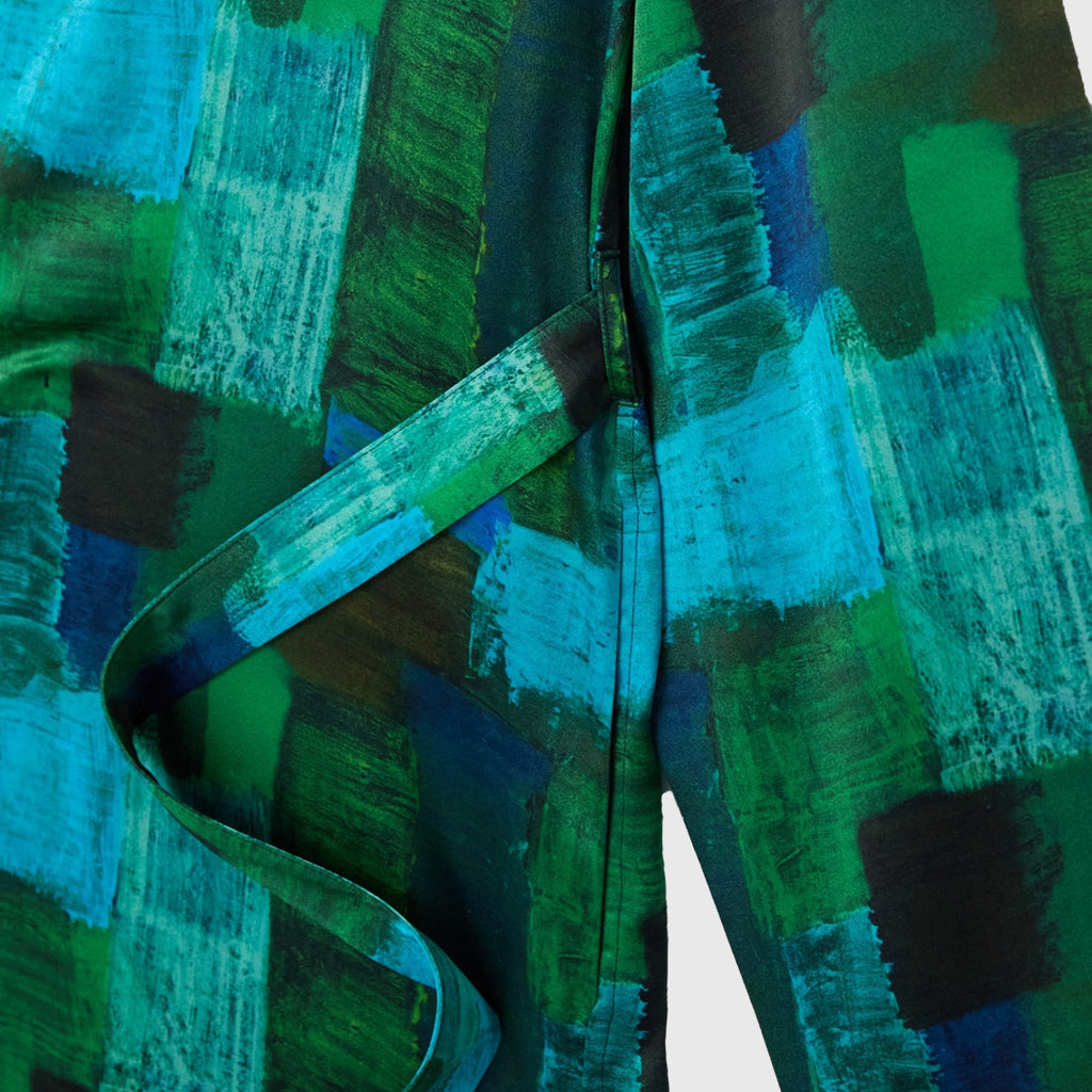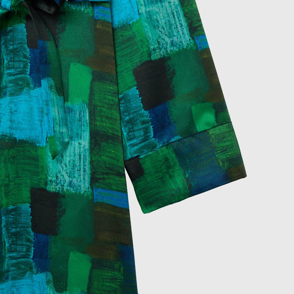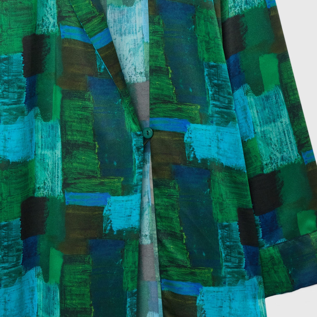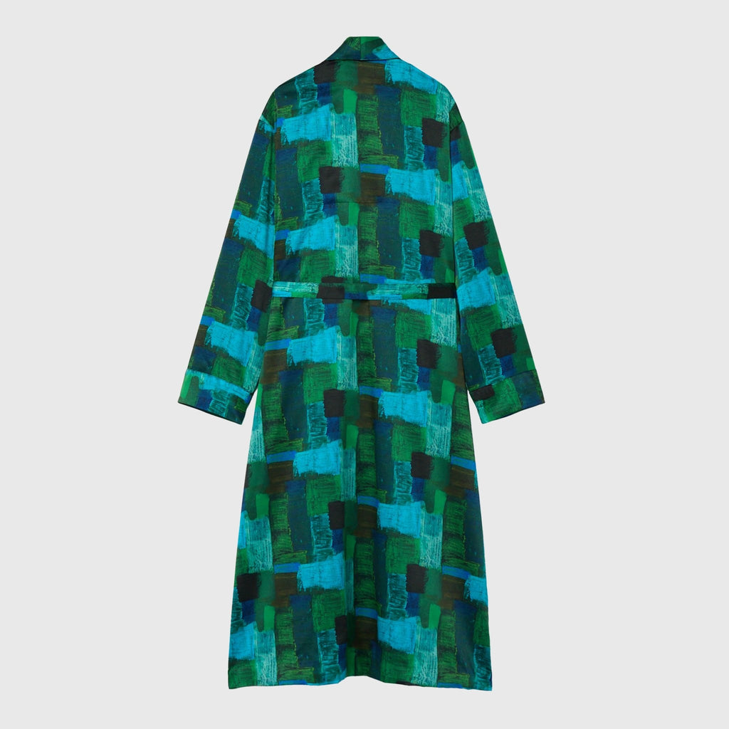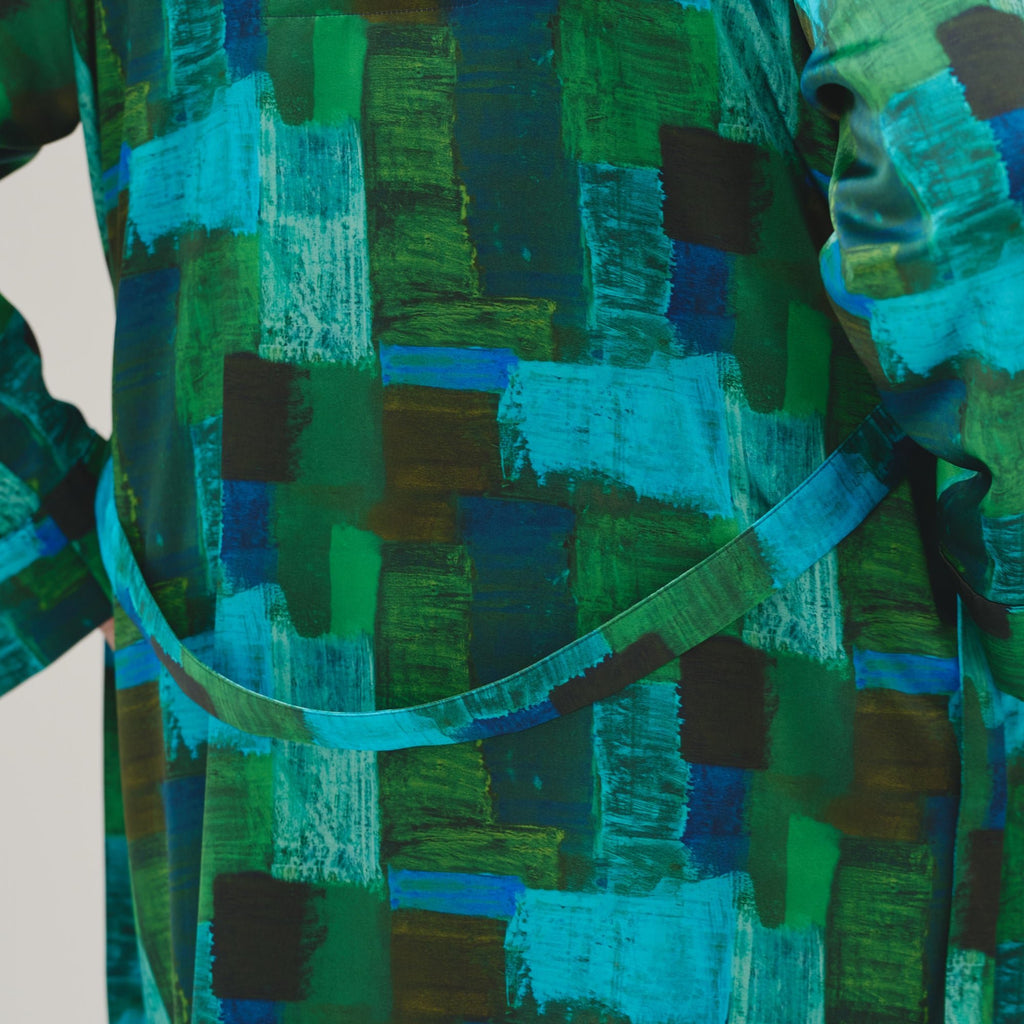 ワンピースとしても、羽織りとしても着られる、リラックス感あふれるガウンコート。レイヤードによって冬から春まで活躍する一枚です。同じアートを起用したサーキュラープリーツスカートとのセットアップもおすすめです。
