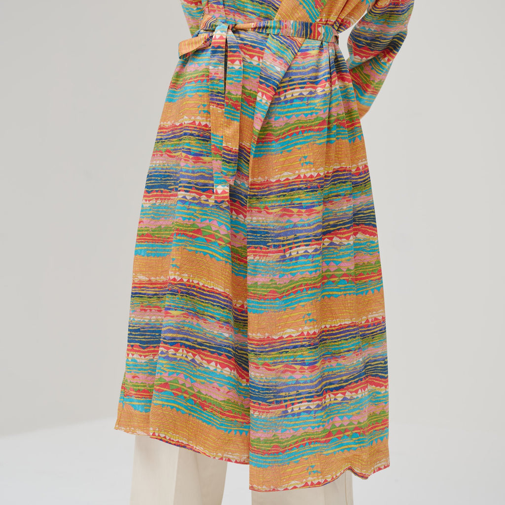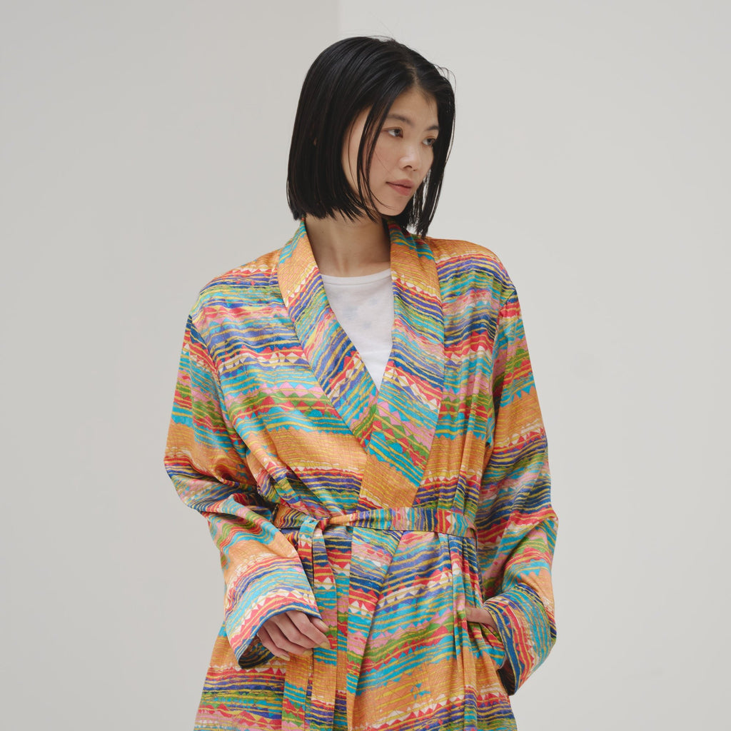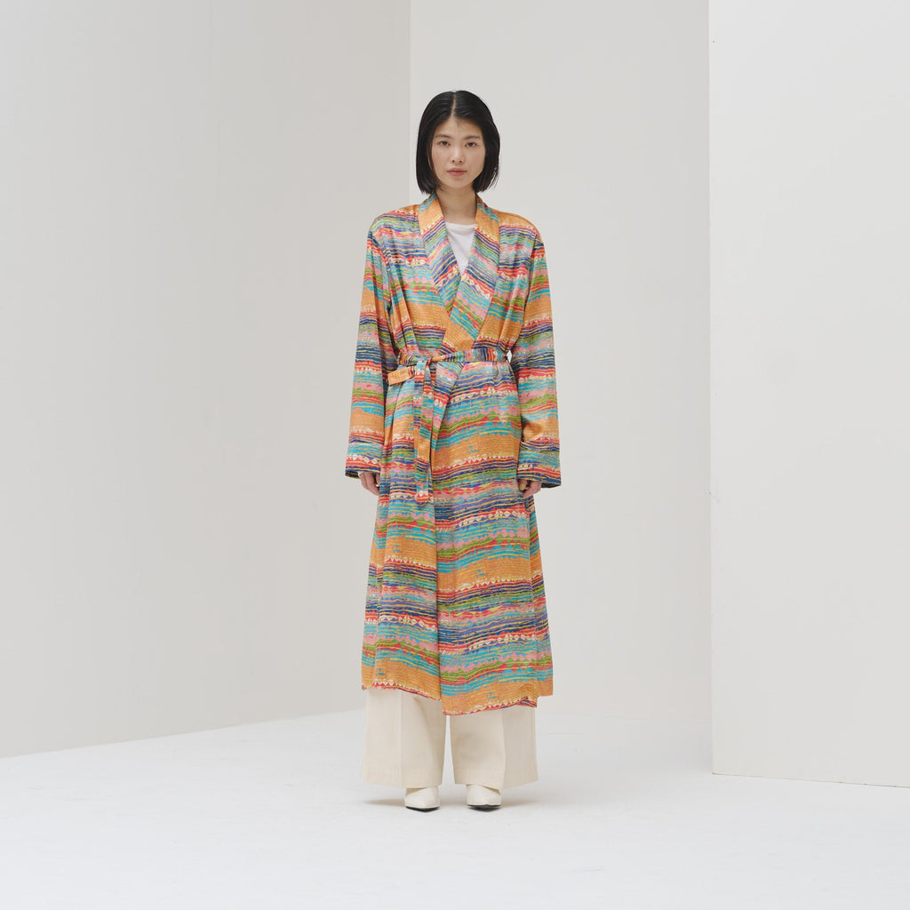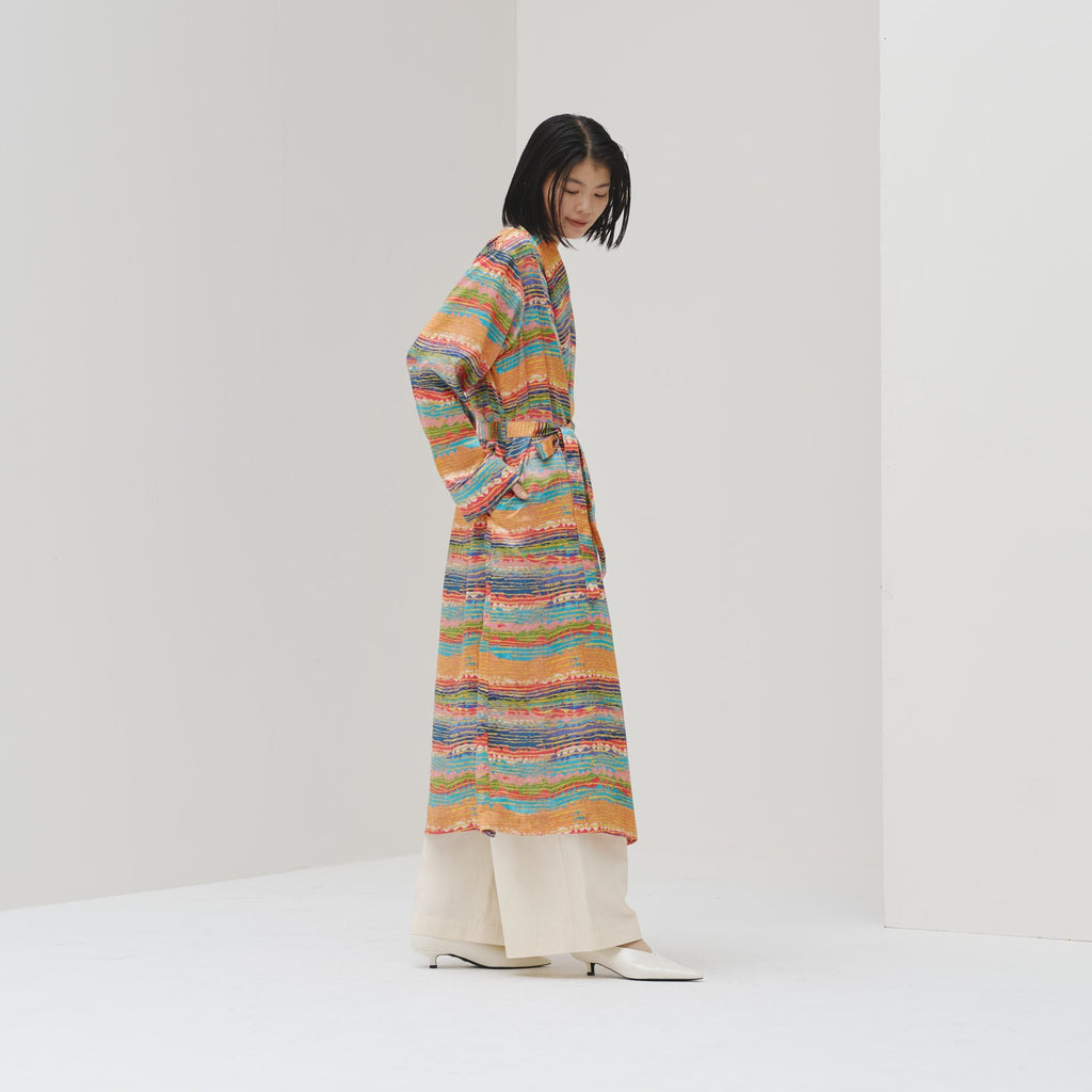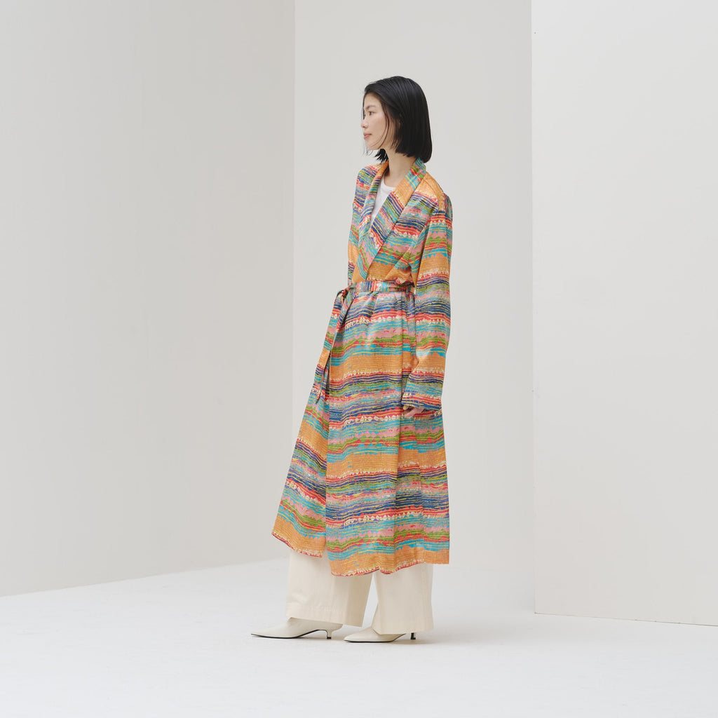 ワンピースとしても、羽織りとしても着られる、リラックス感あふれるガウンコート。レイヤードによって冬から春まで活躍する一枚です。同じアートを起用したサーキュラープリーツスカートとのセットアップもおすすめです。