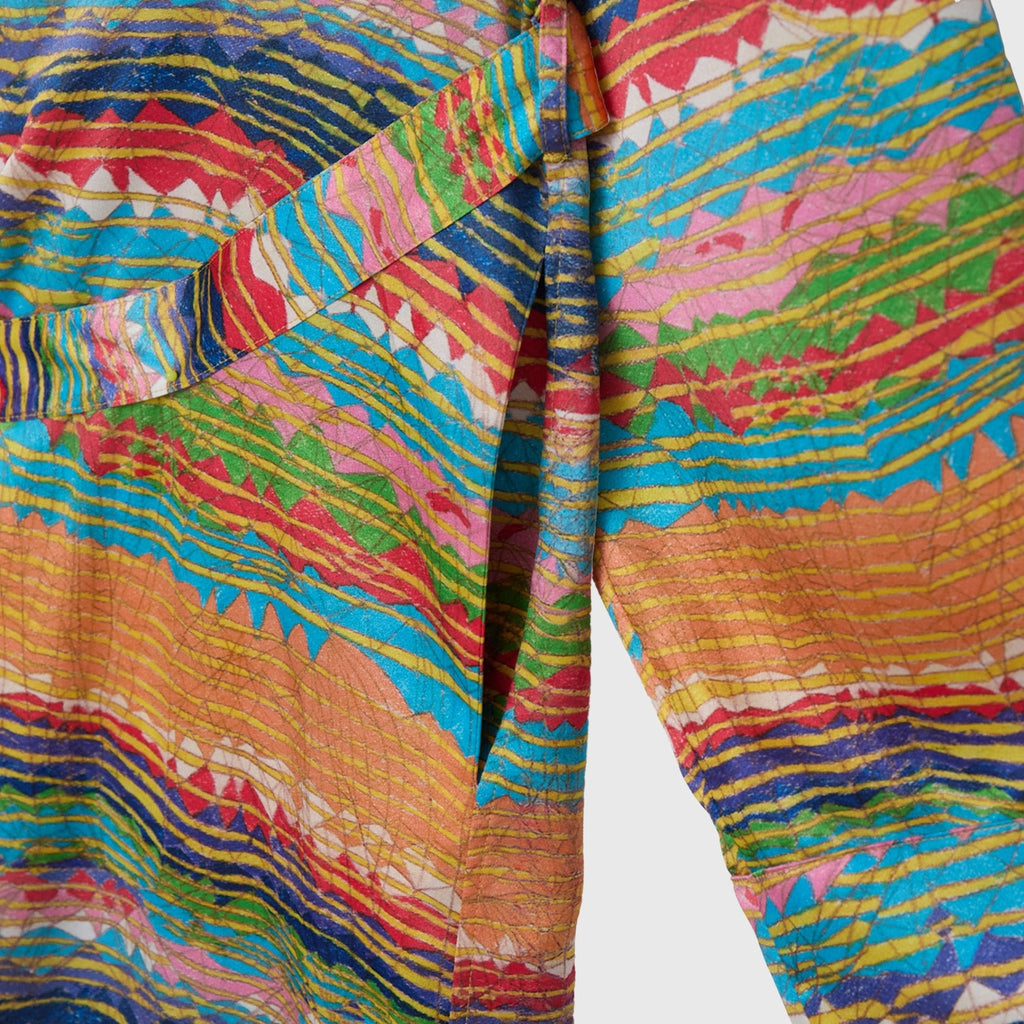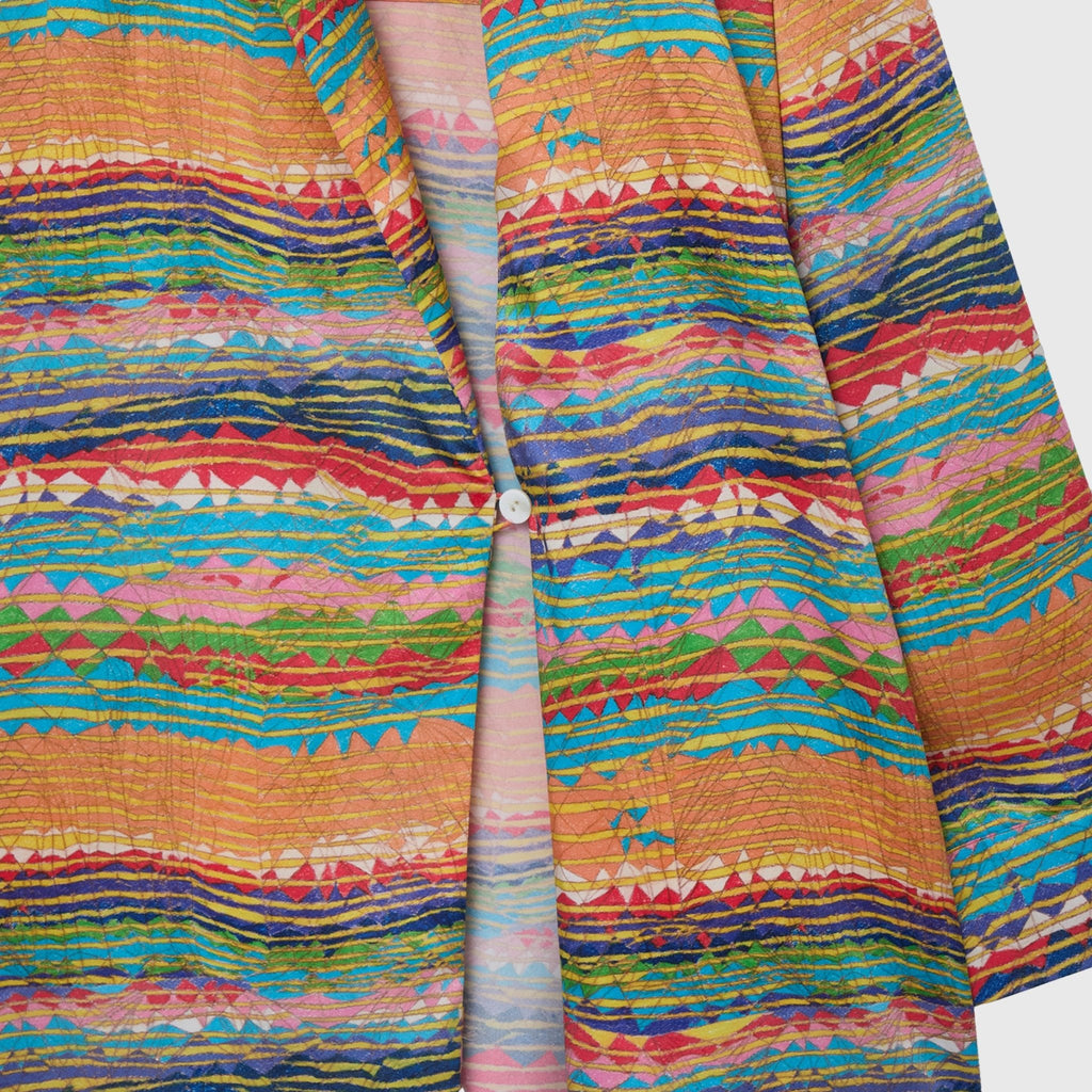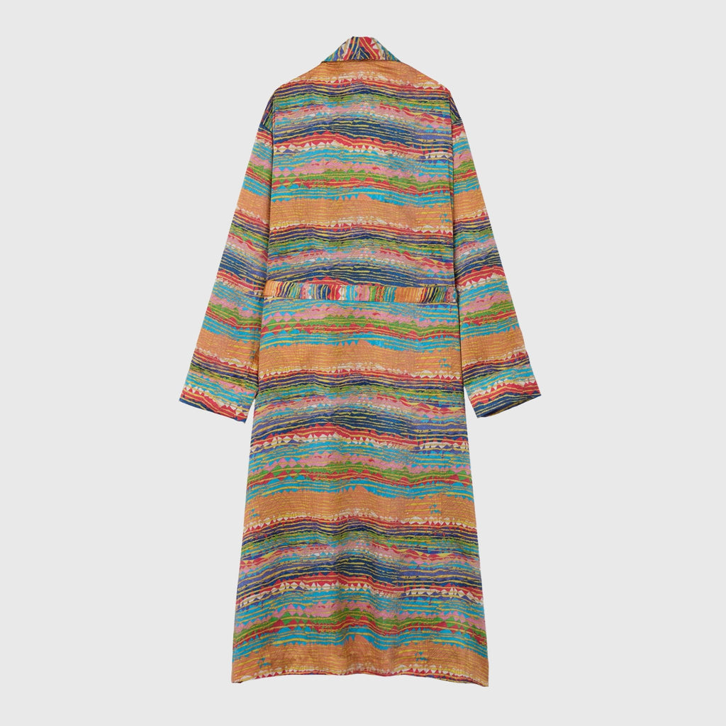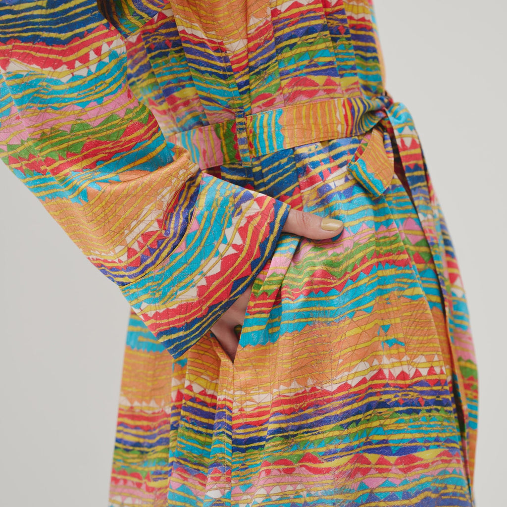 ワンピースとしても、羽織りとしても着られる、リラックス感あふれるガウンコート。レイヤードによって冬から春まで活躍する一枚です。同じアートを起用したサーキュラープリーツスカートとのセットアップもおすすめです。