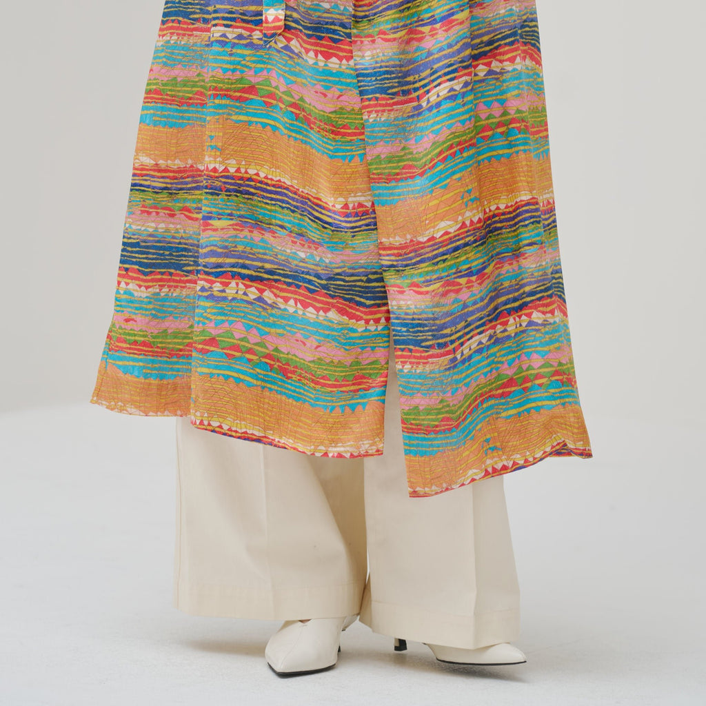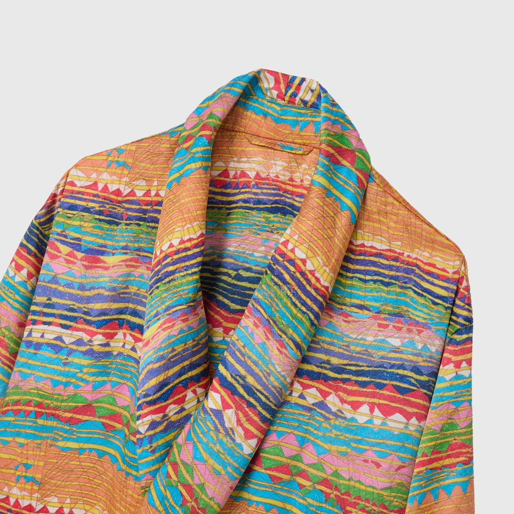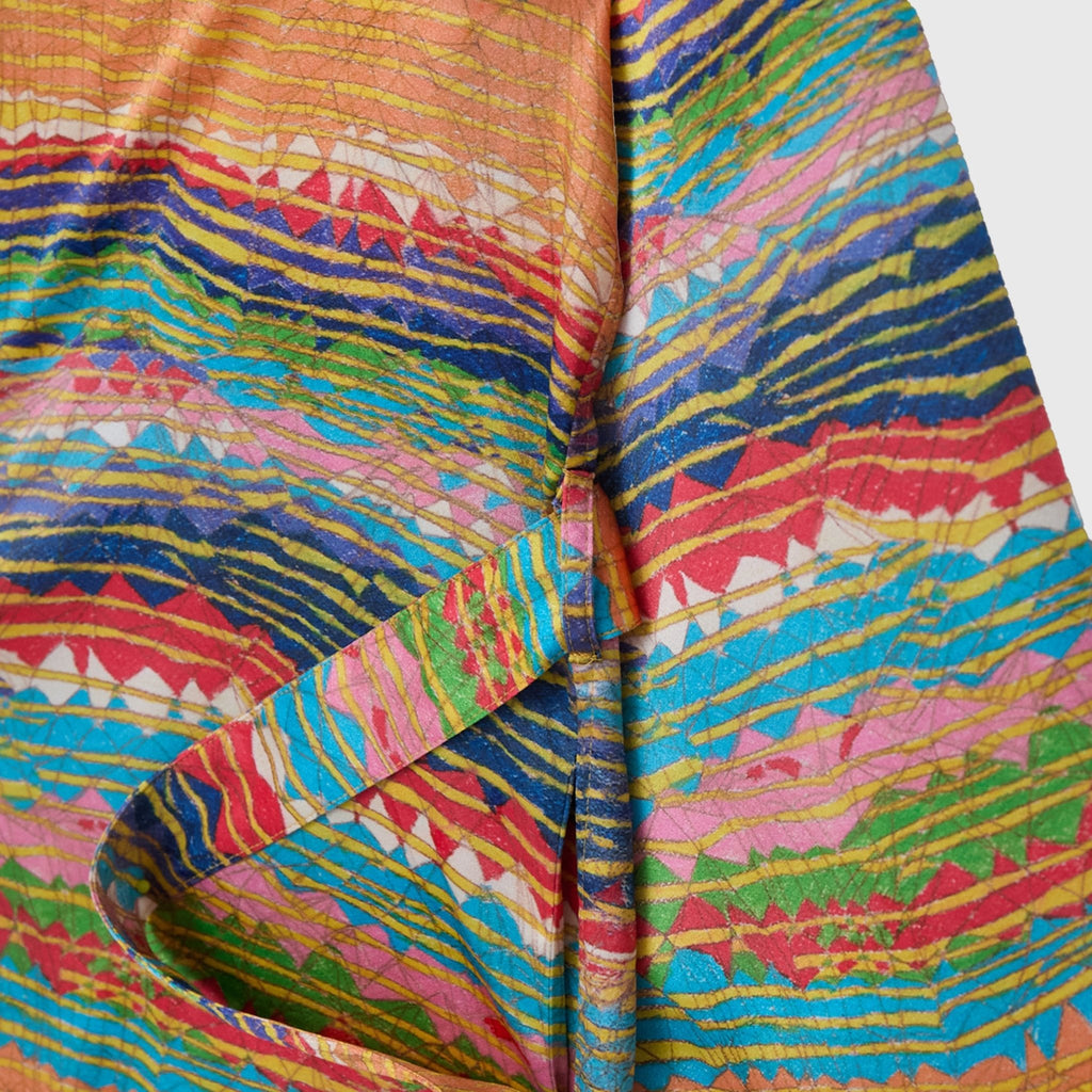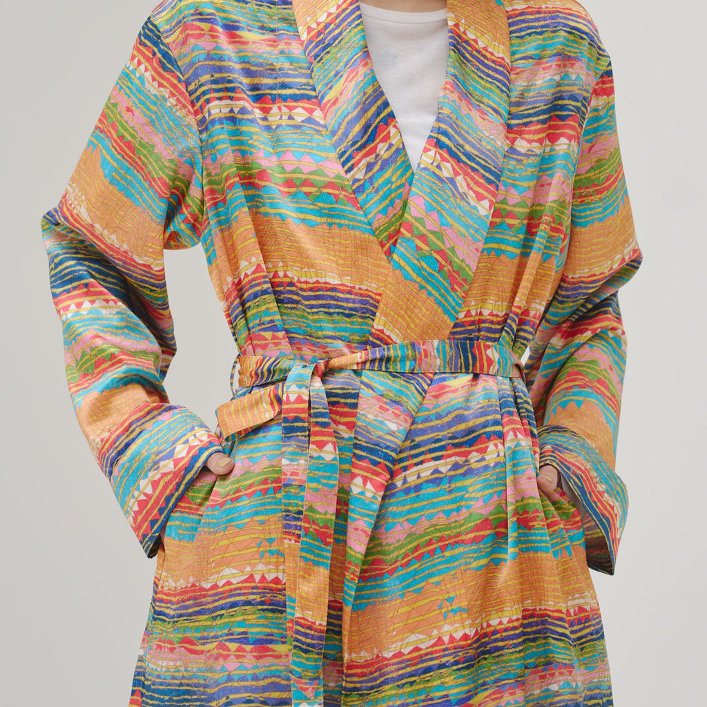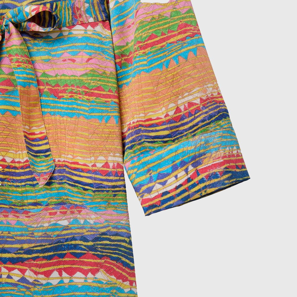ワンピースとしても、羽織りとしても着られる、リラックス感あふれるガウンコート。レイヤードによって冬から春まで活躍する一枚です。同じアートを起用したサーキュラープリーツスカートとのセットアップもおすすめです。