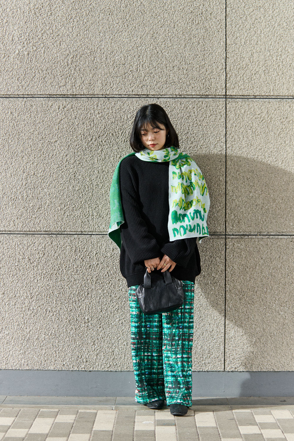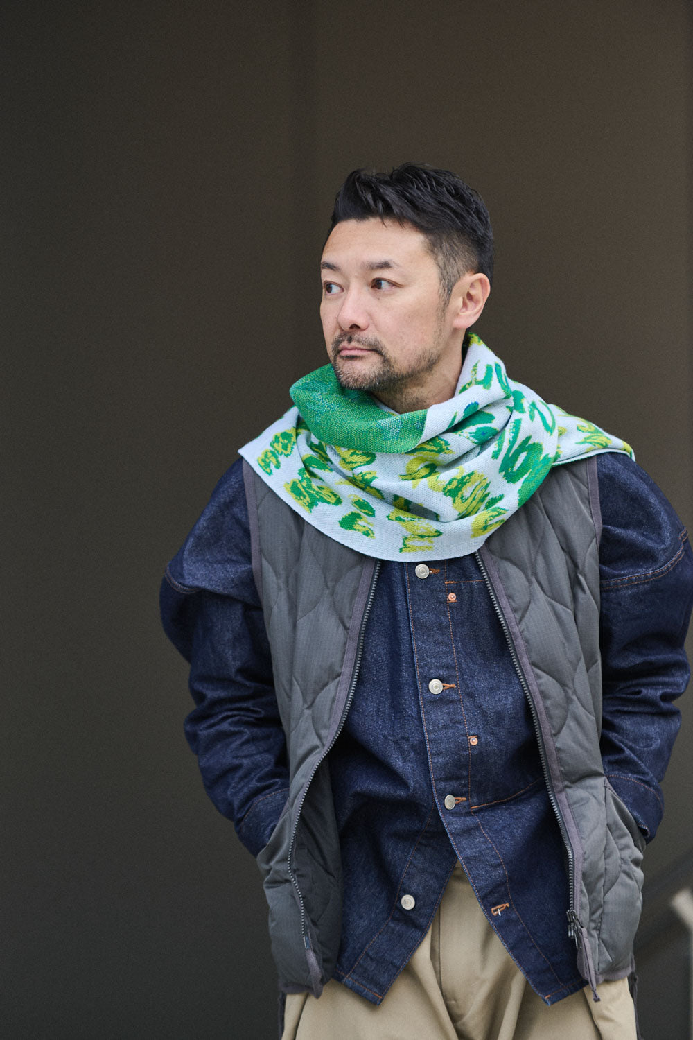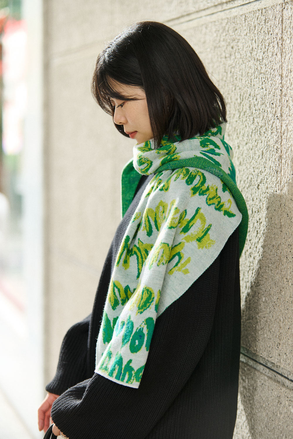 秋冬のスタイリングに、さっと巻くだけでアクセントになるロングマフラー。ジャカード織りによって、作品の質感までも忠実に再現しています。異なる風合いの糸を組み合わせることで、軽やかで上品な表情が生まれ、カジュアルなファッションを洗練された印象に仕上げます。