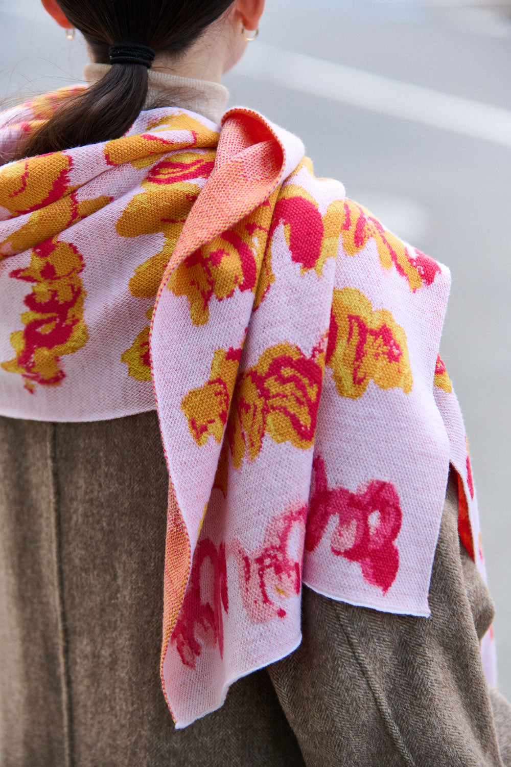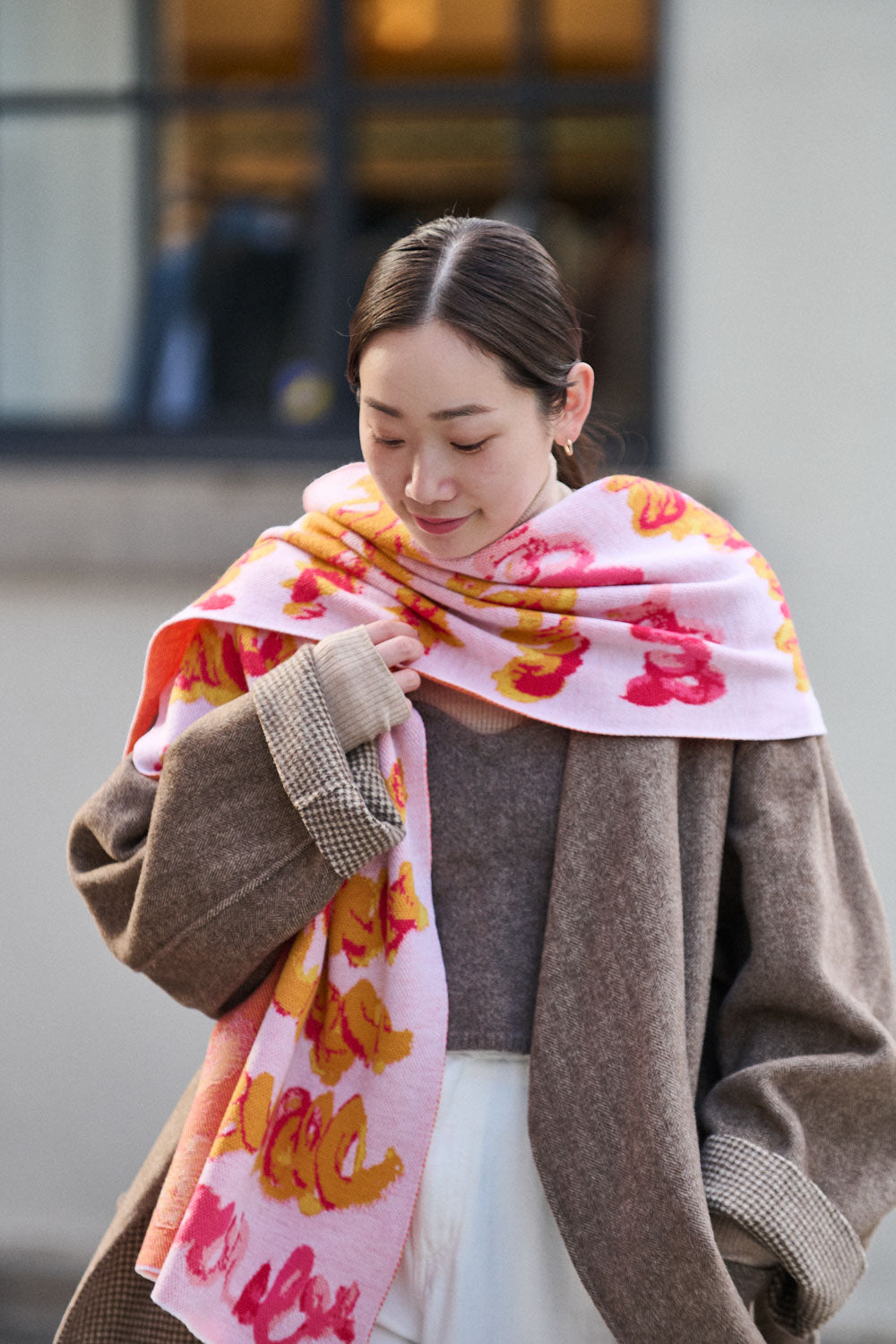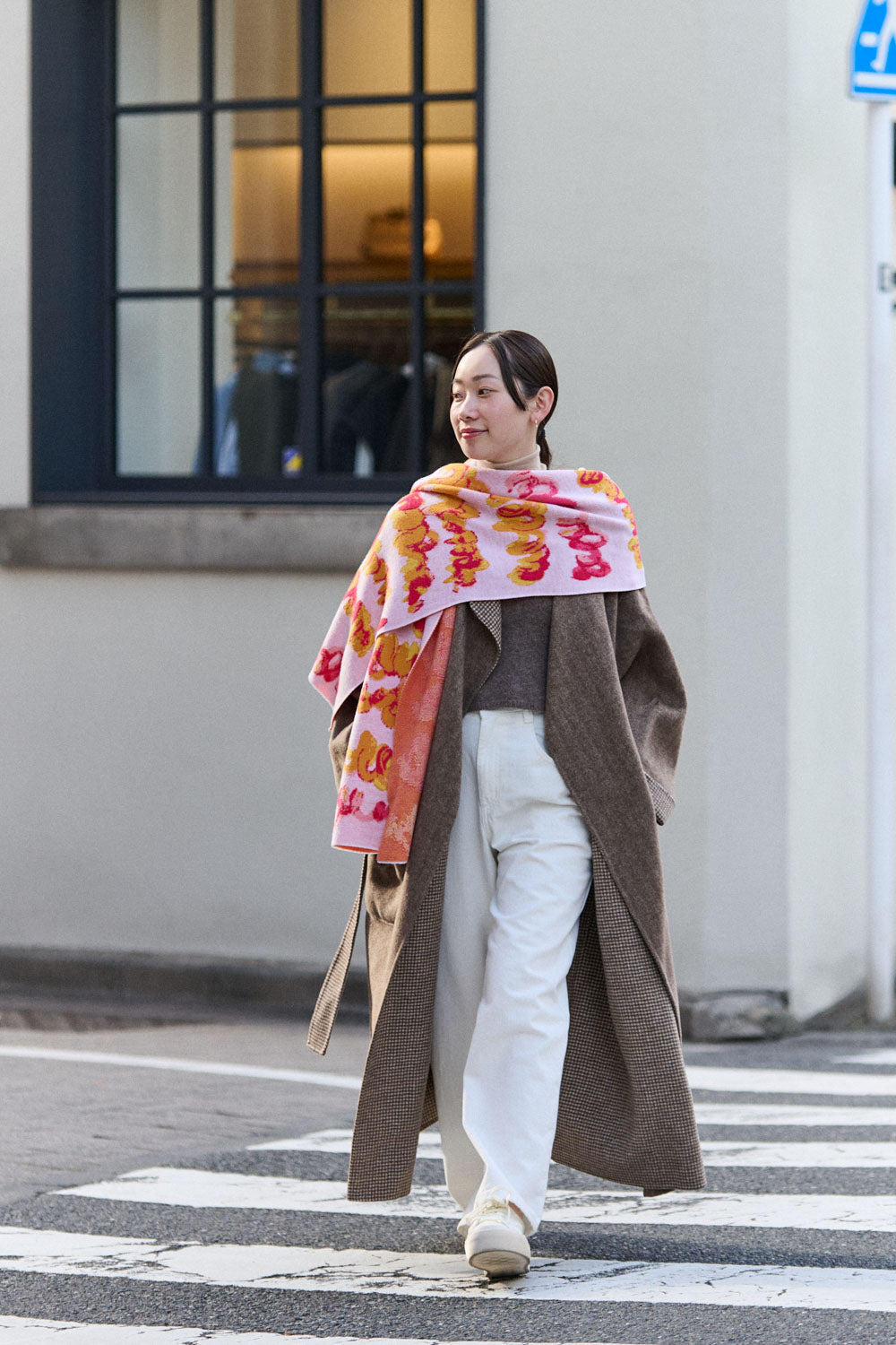 秋冬のスタイリングに、さっと巻くだけでアクセントになるロングマフラー。ジャカード織りによって、作品の質感までも忠実に再現しています。異なる風合いの糸を組み合わせることで、軽やかで上品な表情が生まれ、カジュアルなファッションを洗練された印象に仕上げます。