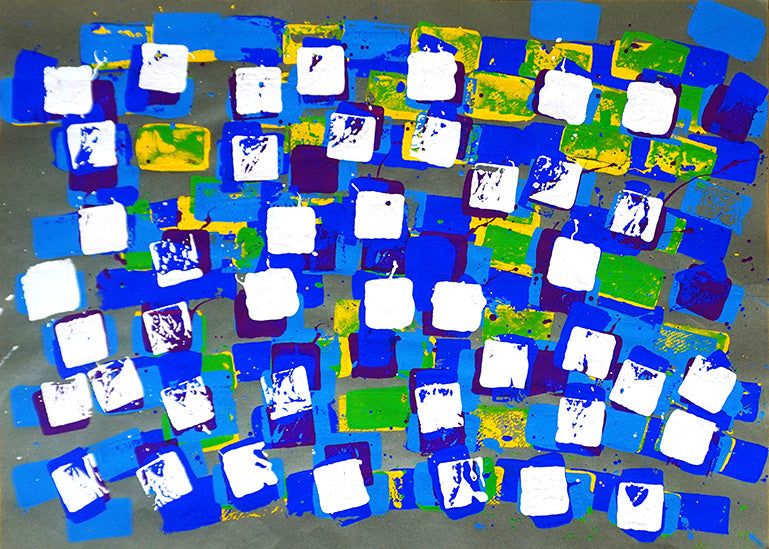 1996年生まれ 滋賀県在住 2015年から『やまなみ工房』に在籍 もともと創作活動に消極的だった彼が、気負いなく作業感覚で取り組める方法のひとつとして、スタンプ押しの活動が始まった。巻いて棒状にしたダンボール紙や紙コップ、ゴム判子等、様々な素材の判子を用いて自分の好きな色を決めて、判子を一つ一つ確実に丁寧に押してゆく。取り組む中で徐々に創作に対する苦手意識から解放され、作品が完成するたびにやりがいや喜び、そして彼の中で創作に対する自信が深まった。 今では内向的な彼が自己表現の一つとして取り組める活動となる。