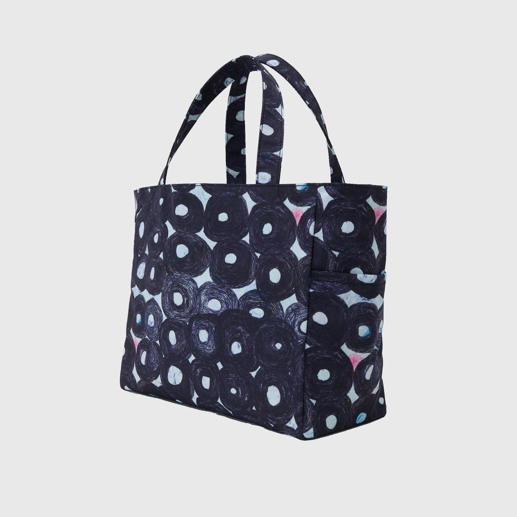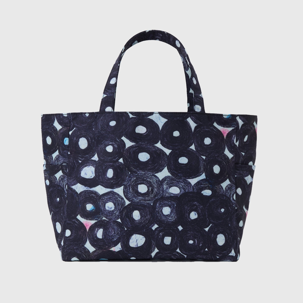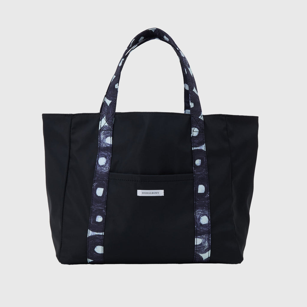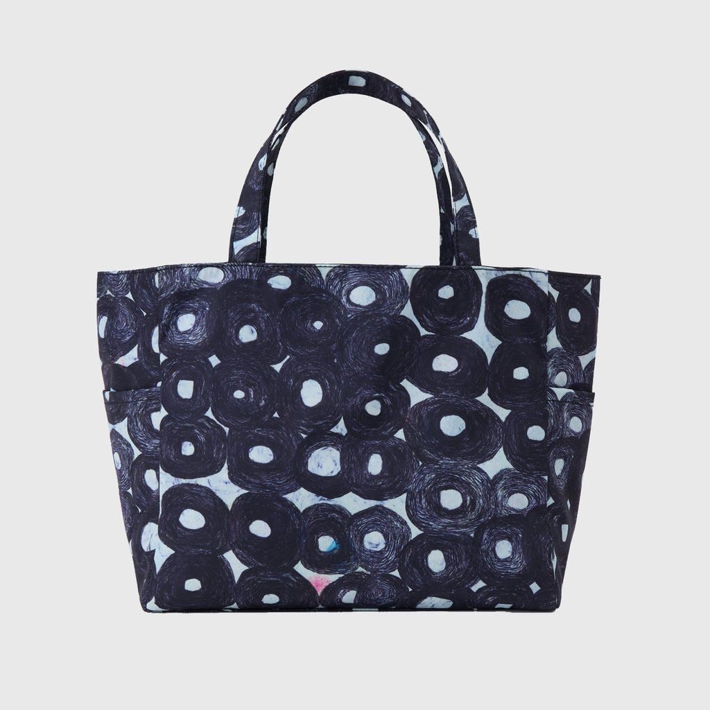 裏表で異なるデザインを楽しめるリバーシブルバッグ。厚みのあるなめらかな手触りの生地を使用し、ほどよい光沢感がカジュアルになりすぎず、さりげないきちんと感を演出します。3つのアートを、2サイズ(S・M)からお選びいただけます。