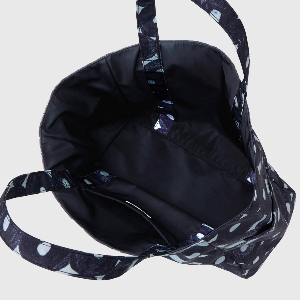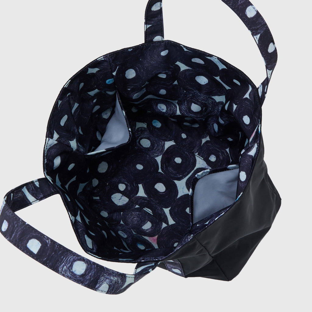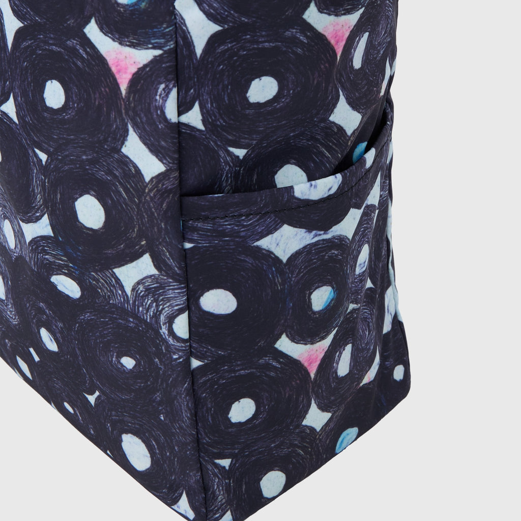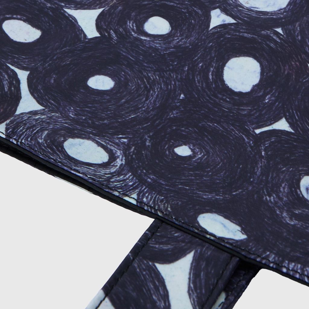 裏表で異なるデザインを楽しめるリバーシブルバッグ。厚みのあるなめらかな手触りの生地を使用し、ほどよい光沢感がカジュアルになりすぎず、さりげないきちんと感を演出します。3つのアートを、2サイズ(S・M)からお選びいただけます。