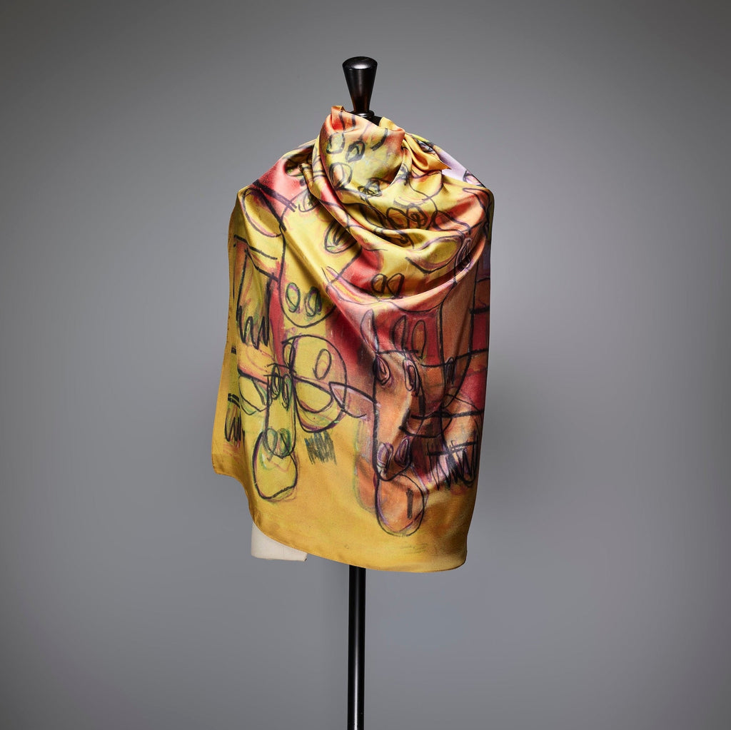 製造工程から見直しを図り、「表も裏も美しい」スカーフに仕上がりました。作品のエネルギーを失うことなく再現するため、シルク素材100%にこだわり、ハリのあるなめらかな肌触りで、首に巻いたときの心地よさも特徴です。