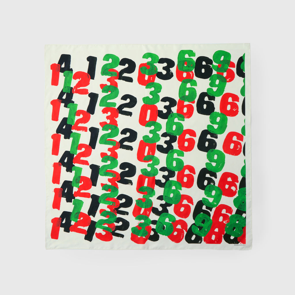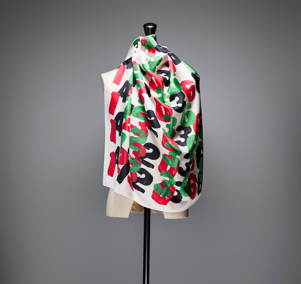 製造工程から見直しを図り、「表も裏も美しい」スカーフに仕上がりました。作品のエネルギーを失うことなく再現するため、シルク素材100%にこだわり、ハリのあるなめらかな肌触りで、首に巻いたときの心地よさも特徴です。