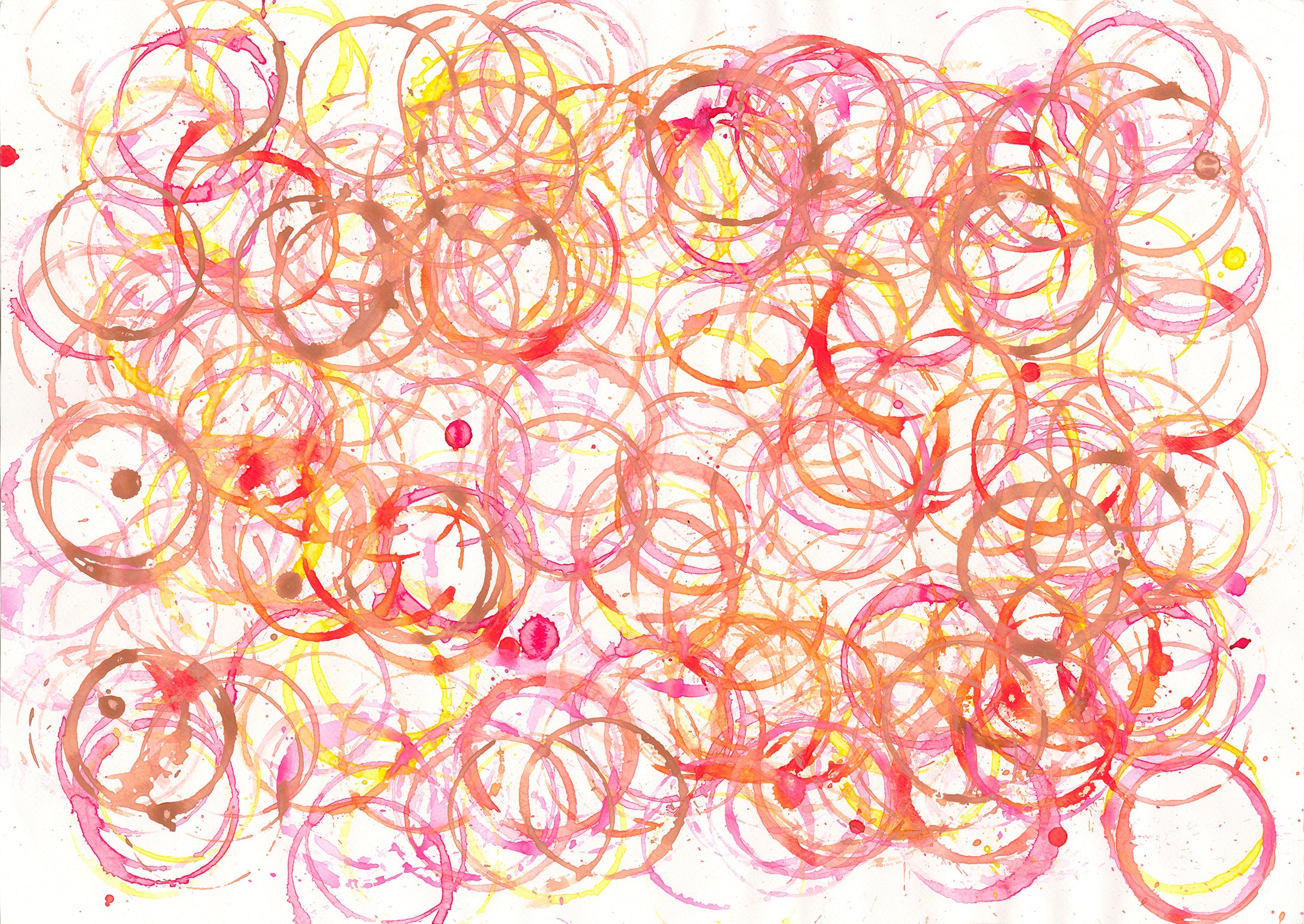1979年生まれ、滋賀県在住。1998年から『やまなみ工房』に在籍 彼女がやまなみへ通所し、初めて行った作業は牛乳パックを使用した紙漉き作業だった。 その作業工程の中、彼女の役割は取り出した紙の繊維を手のひらで丸め細かな玉を作る作業であった。20年以上たった現在では、その作業はなくなり彼女の活動も変化してきたが、今も彼女の中には仕事というと両手で繊維を丸める行為を表す。そして今、活動の幅が広がり、紙コップを用いて自分の好きな色を決め、判子を一つ一つ丁寧に押していく。紙コップの丸が様々な色で積み重なり、色鮮やかに仕上げていく。 彼女の中で陶土を丸めて玉を作る行為、判子を押す行為は仕事としての位置づけを成し、達成感とやりがいや意欲につながっているのであろう。