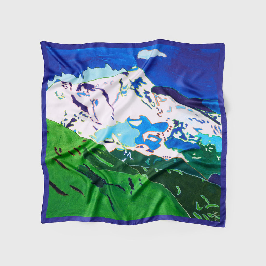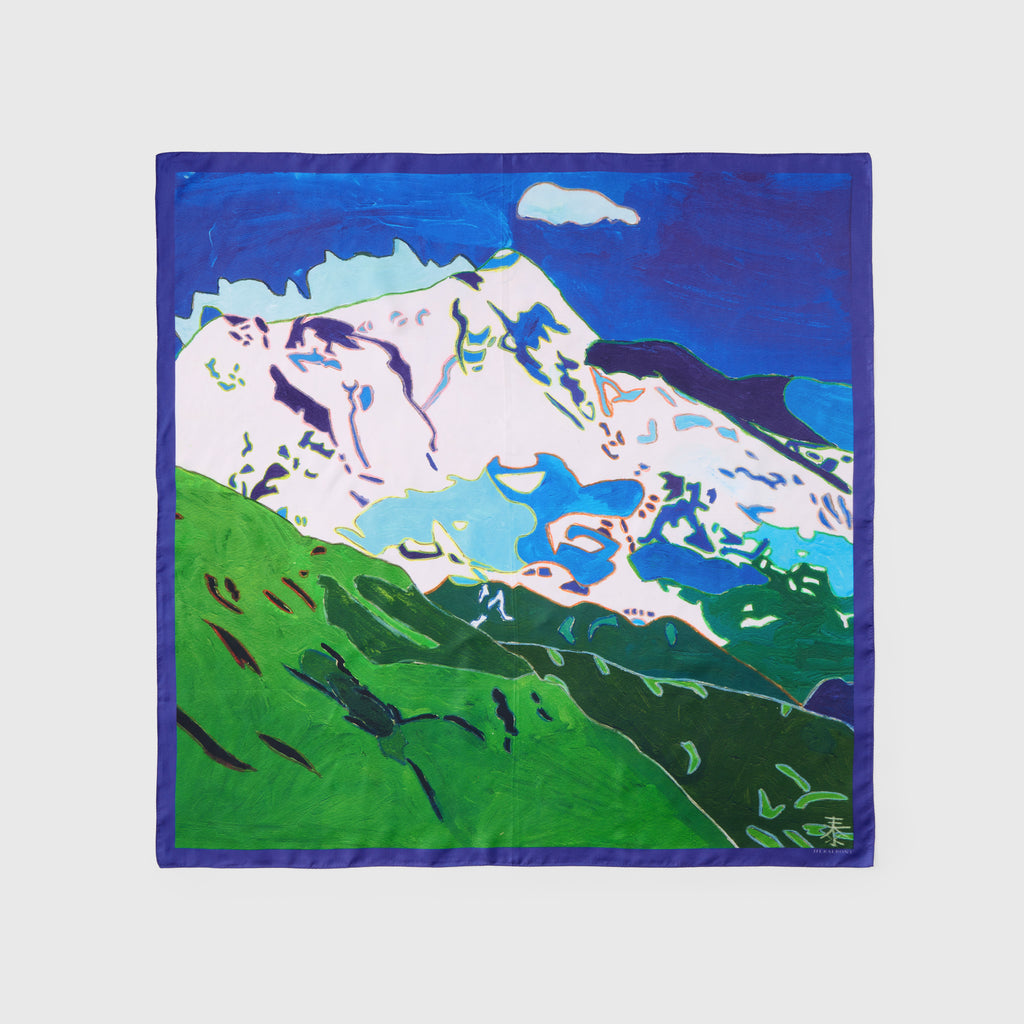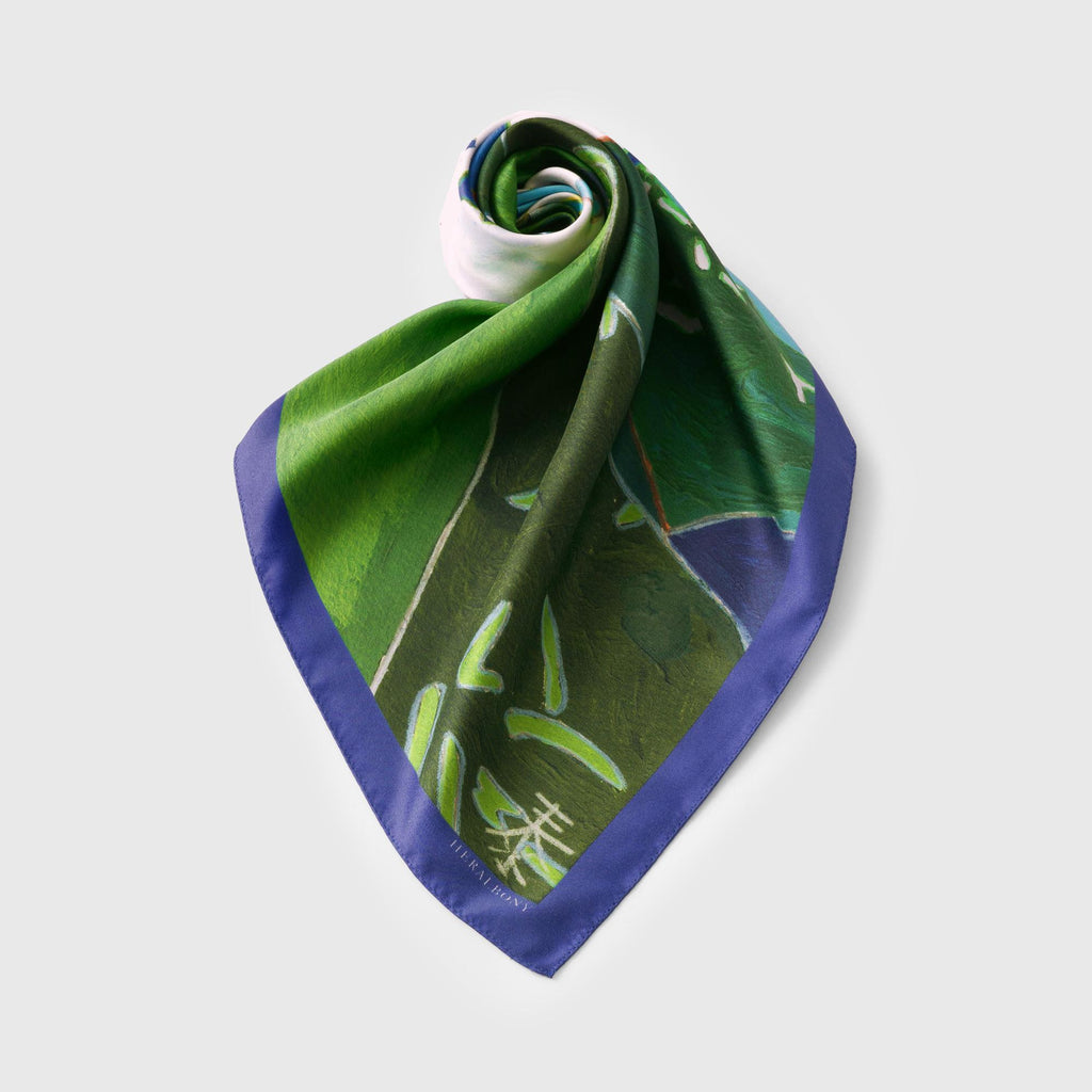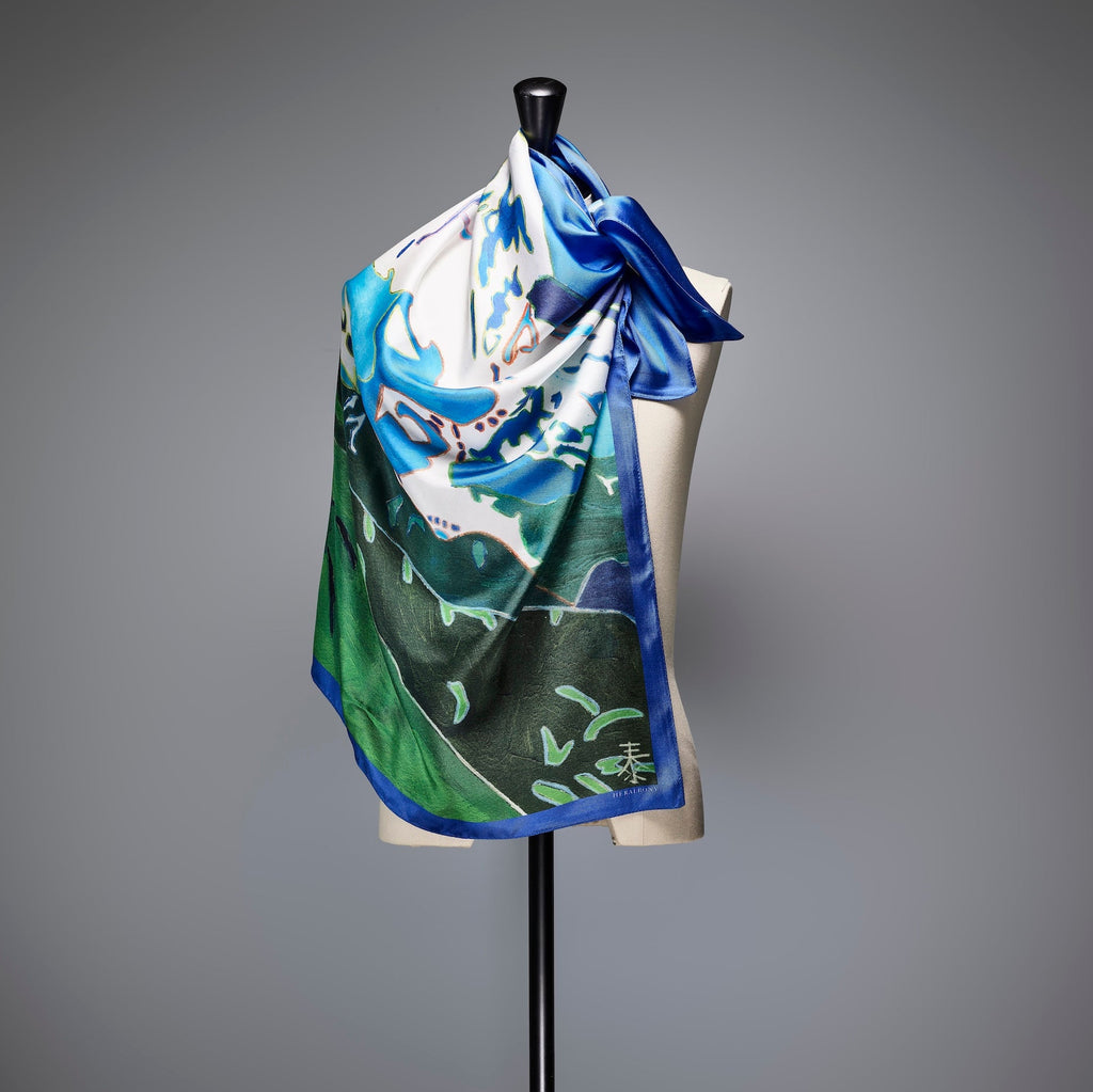 製造工程から見直しを図り、「表も裏も美しい」スカーフに仕上がりました。作品のエネルギーを失うことなく再現するため、シルク素材100%にこだわり、ハリのあるなめらかな肌触りで、首に巻いたときの心地よさも特徴です。