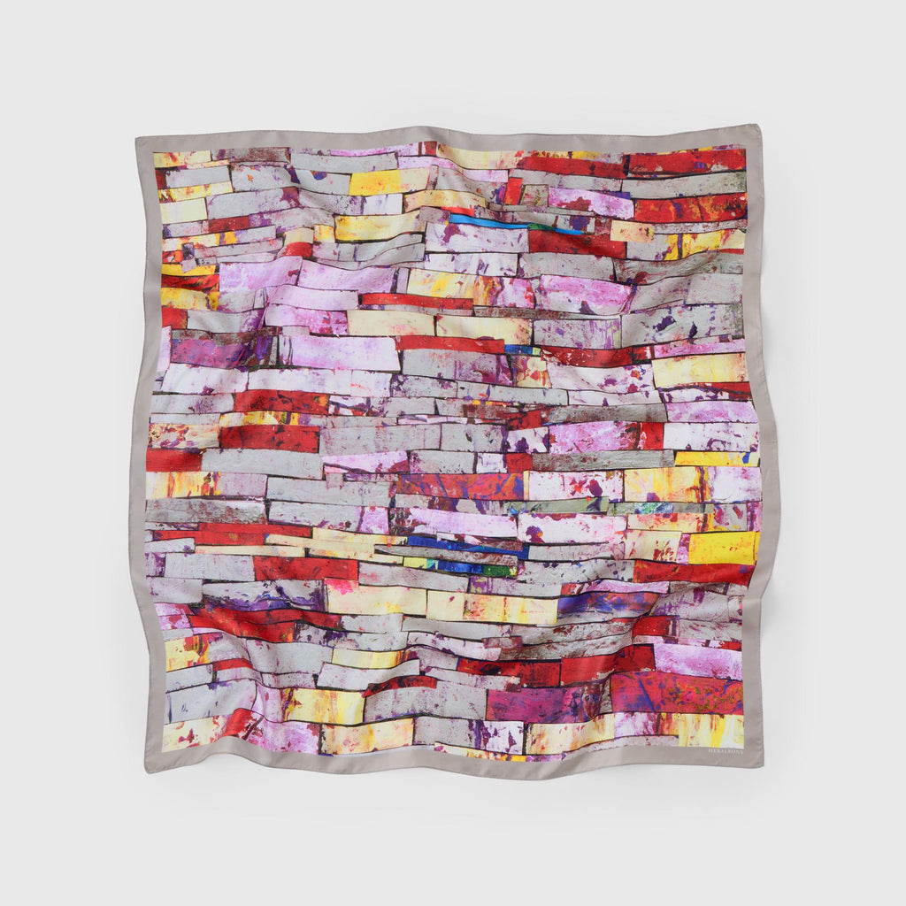 製造工程から見直しを図り、「表も裏も美しい」スカーフに仕上がりました。作品のエネルギーを失うことなく再現するため、シルク素材100%にこだわり、ハリのあるなめらかな肌触りで、首に巻いたときの心地よさも特徴です。