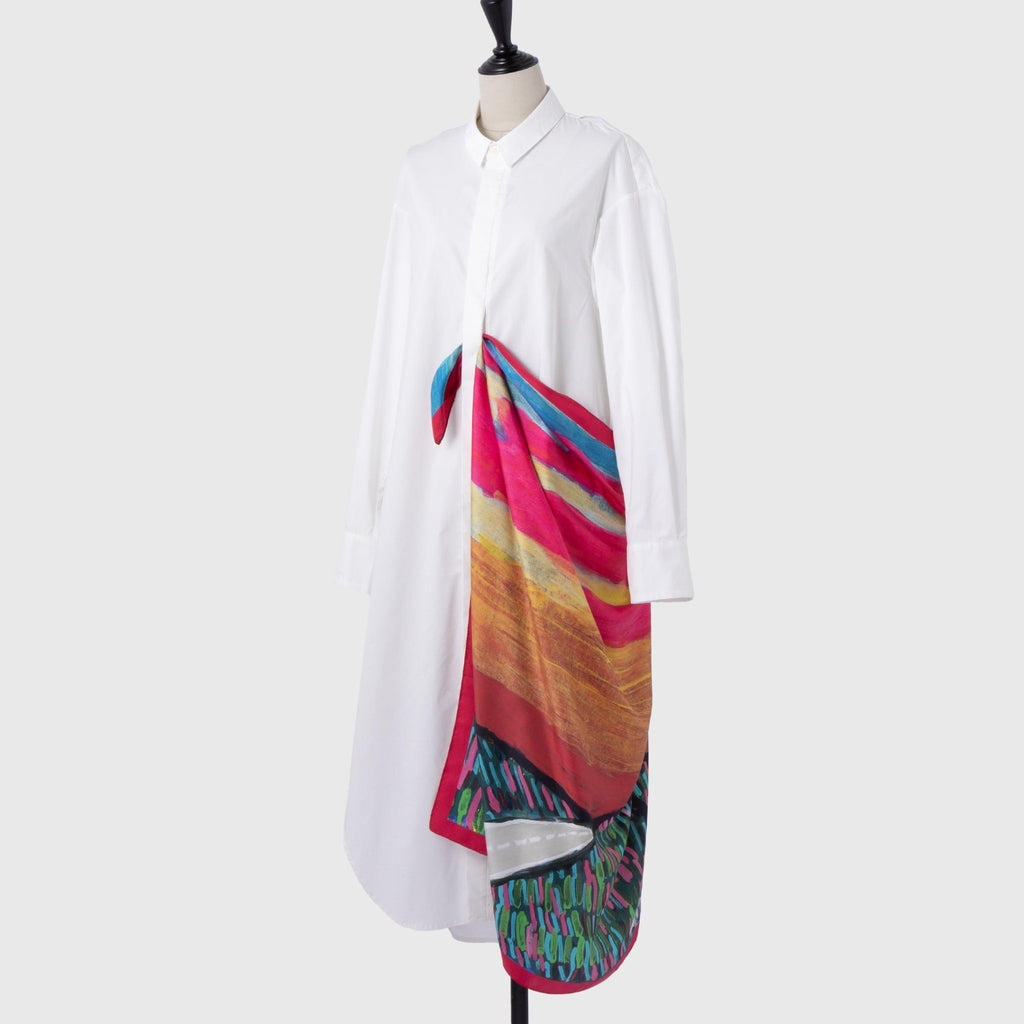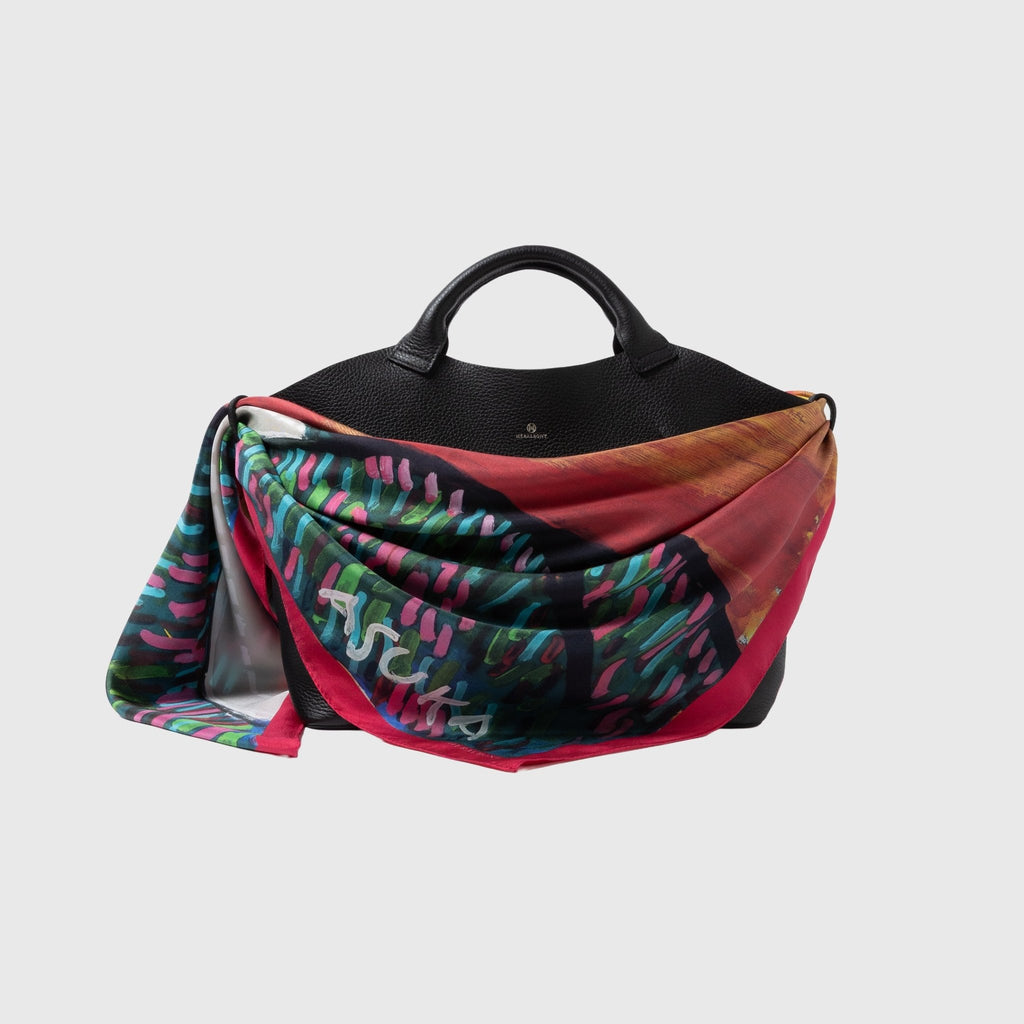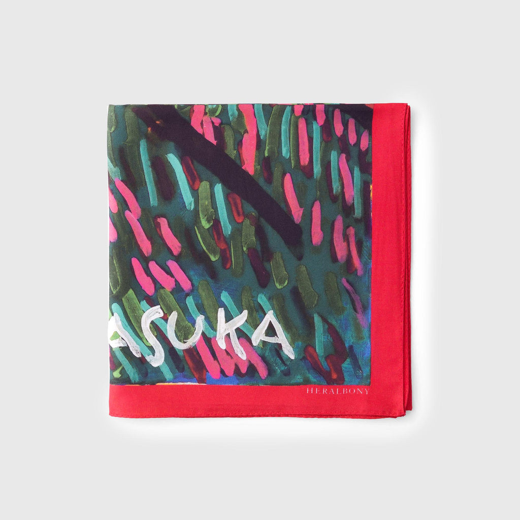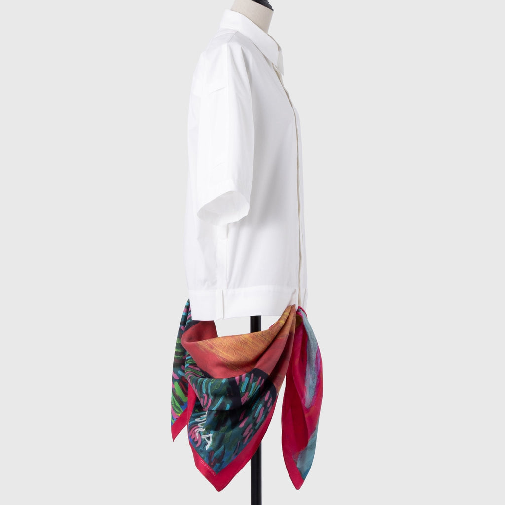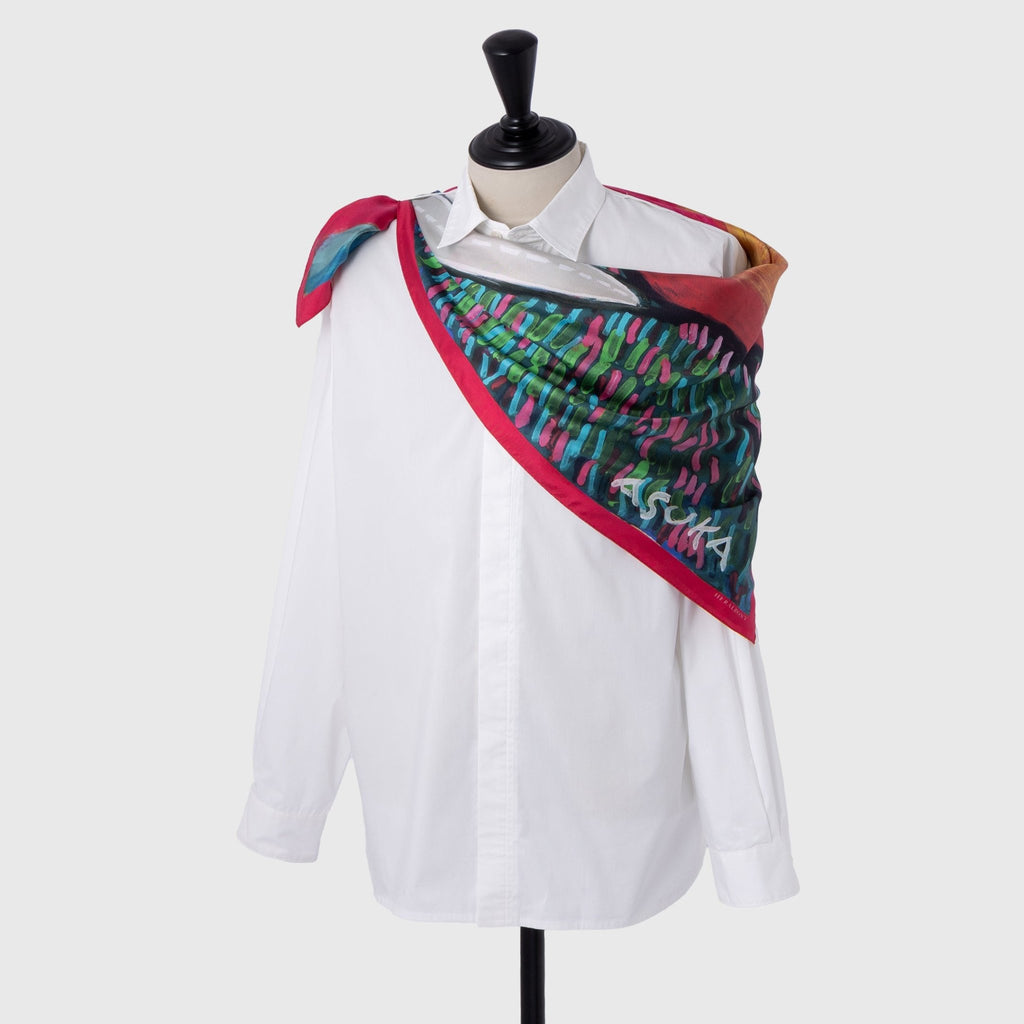 製造工程から見直しを図り、「表も裏も美しい」スカーフに仕上がりました。作品のエネルギーを失うことなく再現するため、シルク素材100%にこだわり、ハリのあるなめらかな肌触りで、首に巻いたときの心地よさも特徴です。