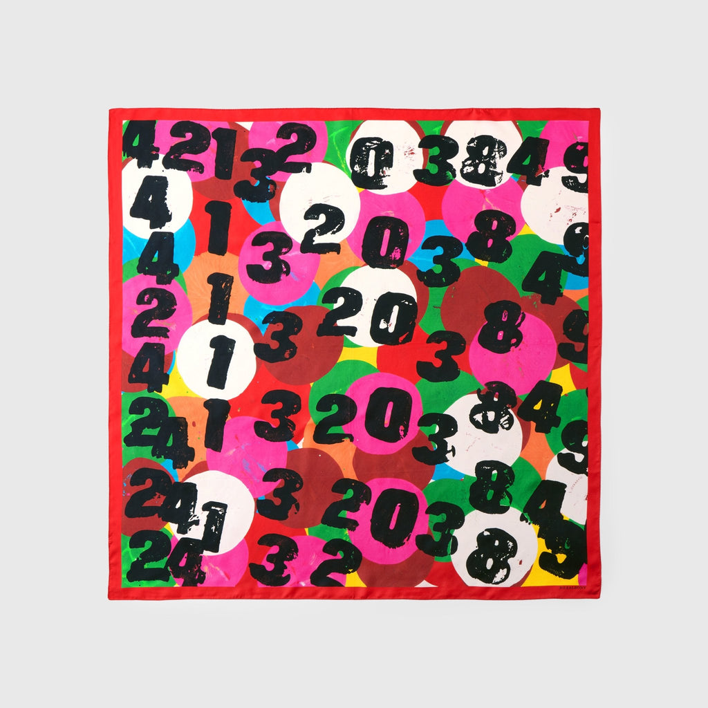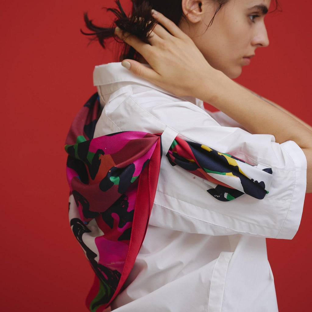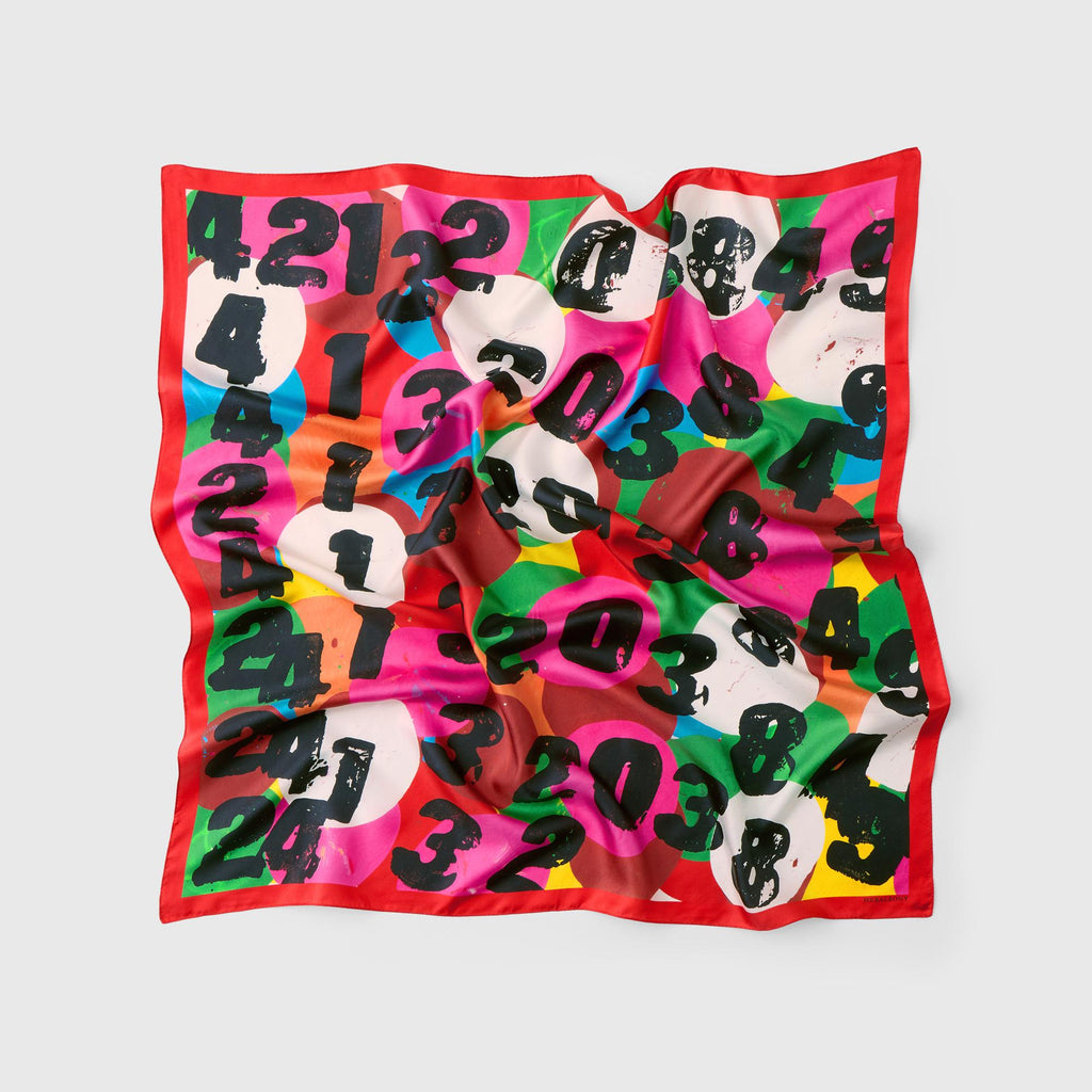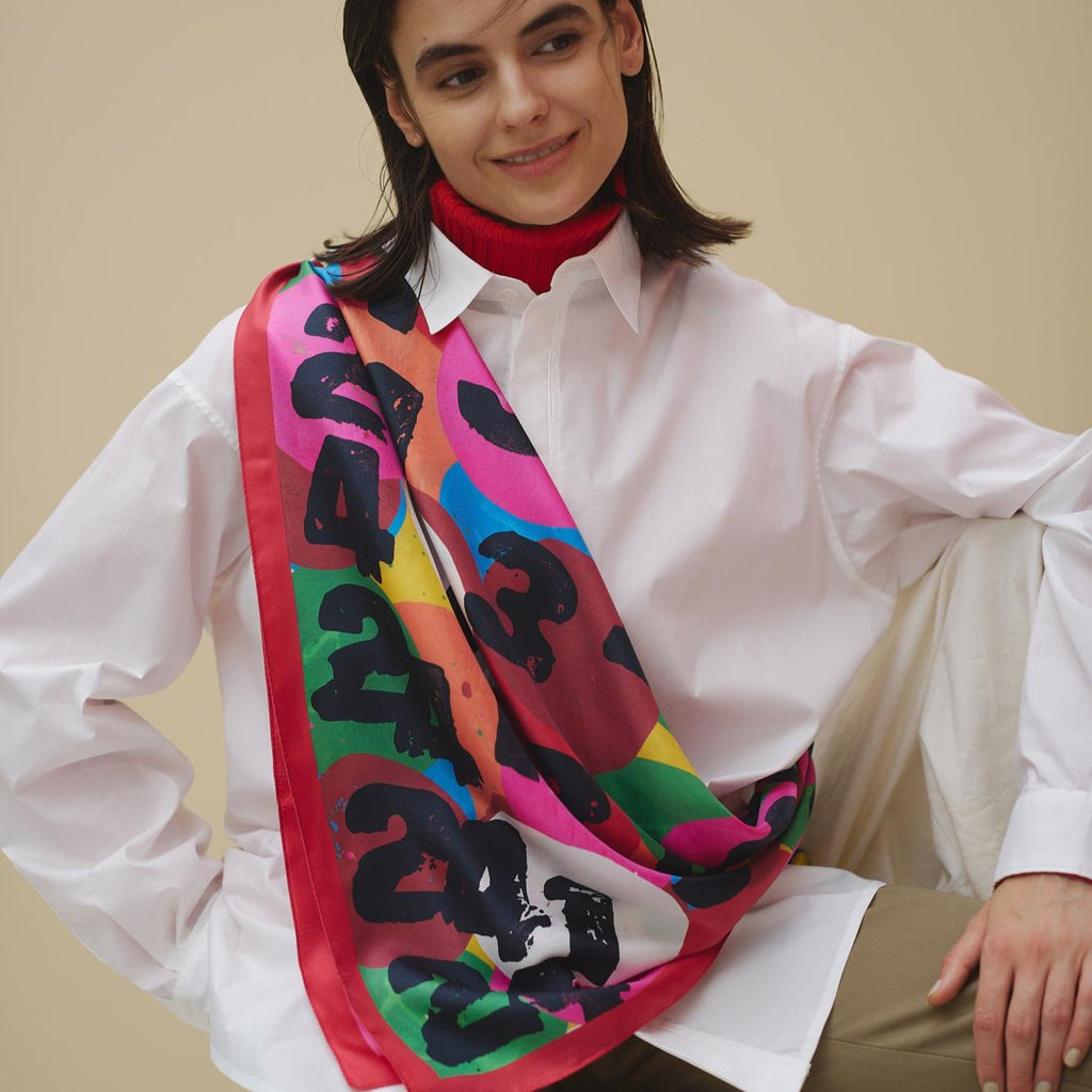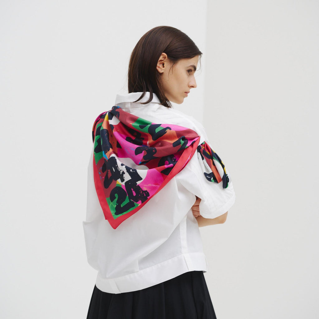 製造工程から見直しを図り、「表も裏も美しい」スカーフに仕上がりました。作品のエネルギーを失うことなく再現するため、シルク素材100%にこだわり、ハリのあるなめらかな肌触りで、首に巻いたときの心地よさも特徴です。