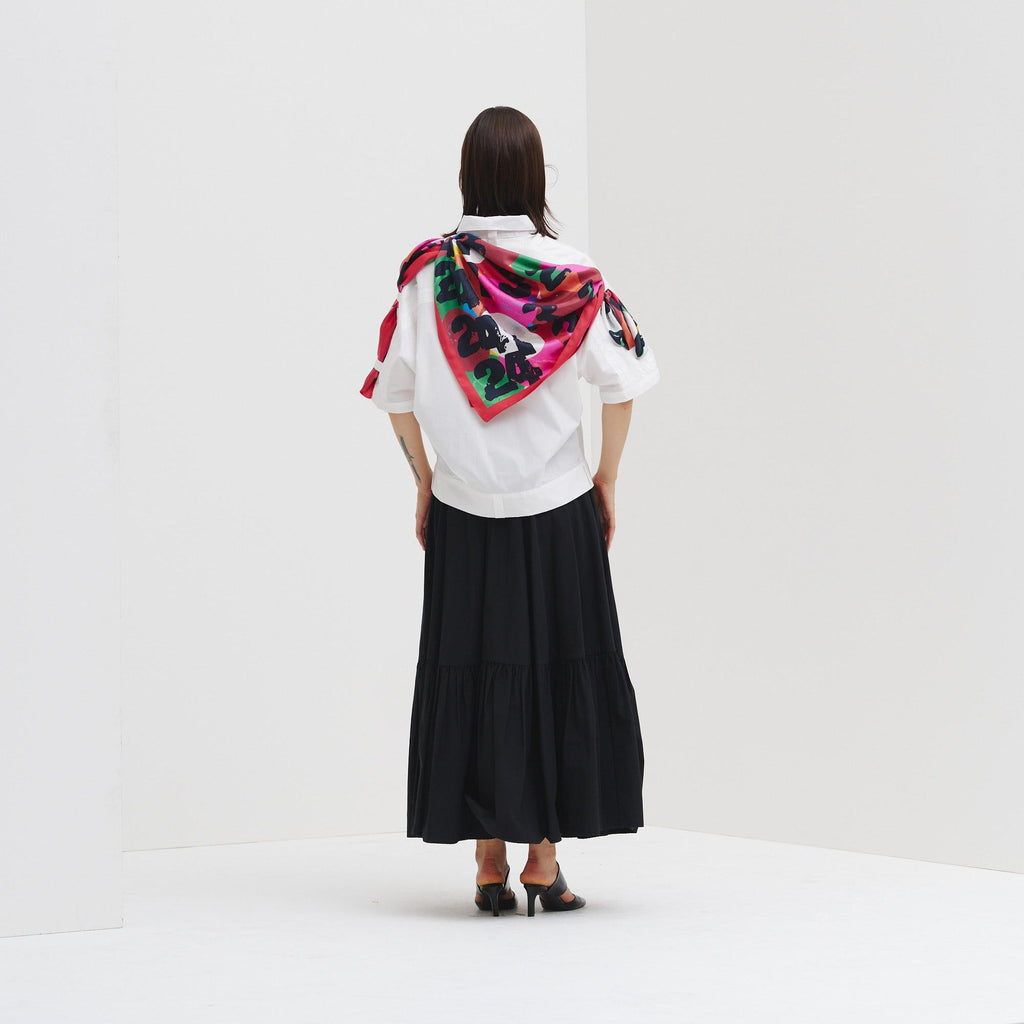88cm×88cmという大判サイズで、さまざまなスタイルをお楽しみいただけます。首元に巻いたり、ベルトとして腰に巻いたり、トップスとしてTシャツに重ねたりと幅広い着こなしが可能です。