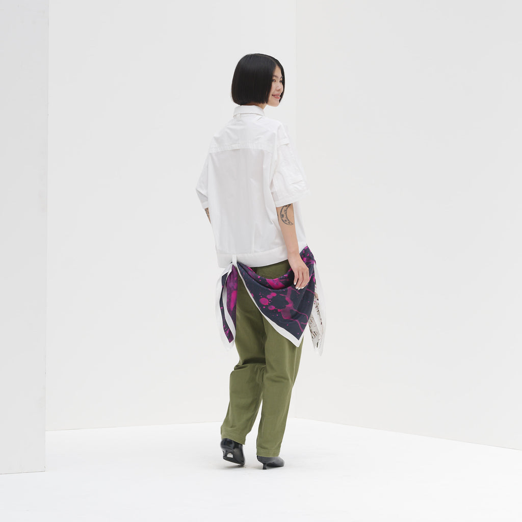 88cm×88cmという大判サイズで、さまざまなスタイルをお楽しみいただけます。首元に巻いたり、ベルトとして腰に巻いたり、トップスとしてTシャツに重ねたりと幅広い着こなしが可能です。