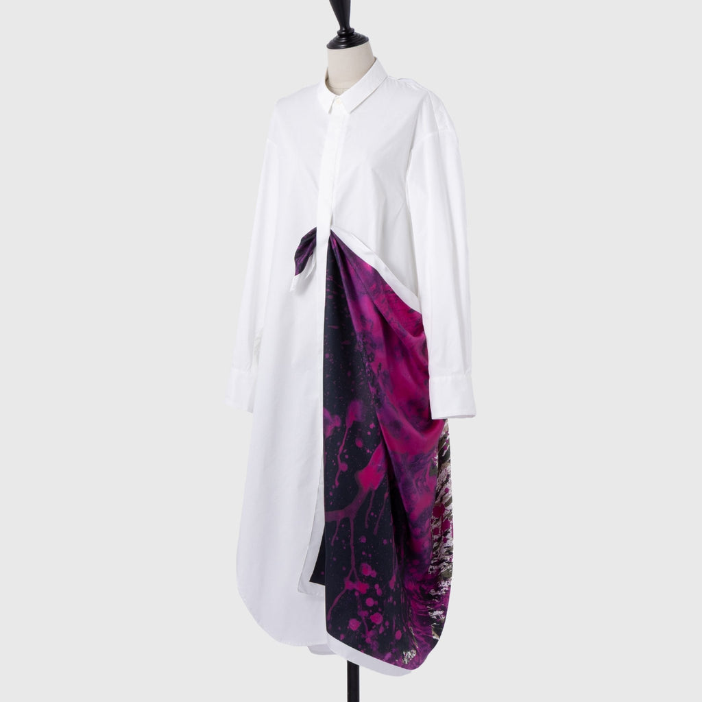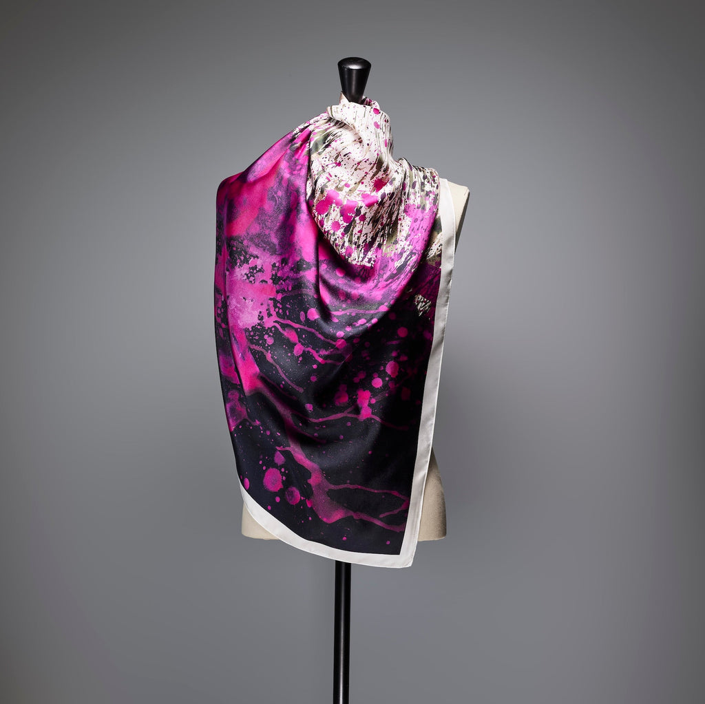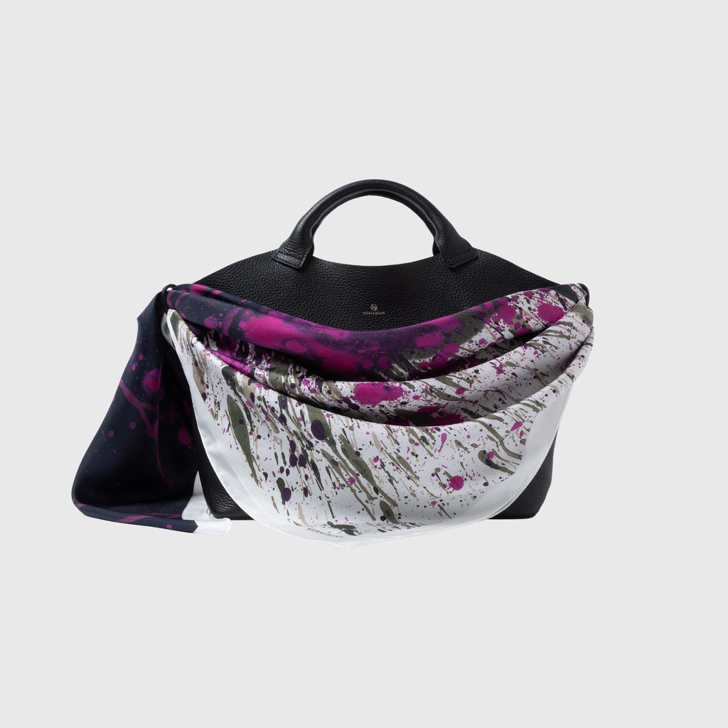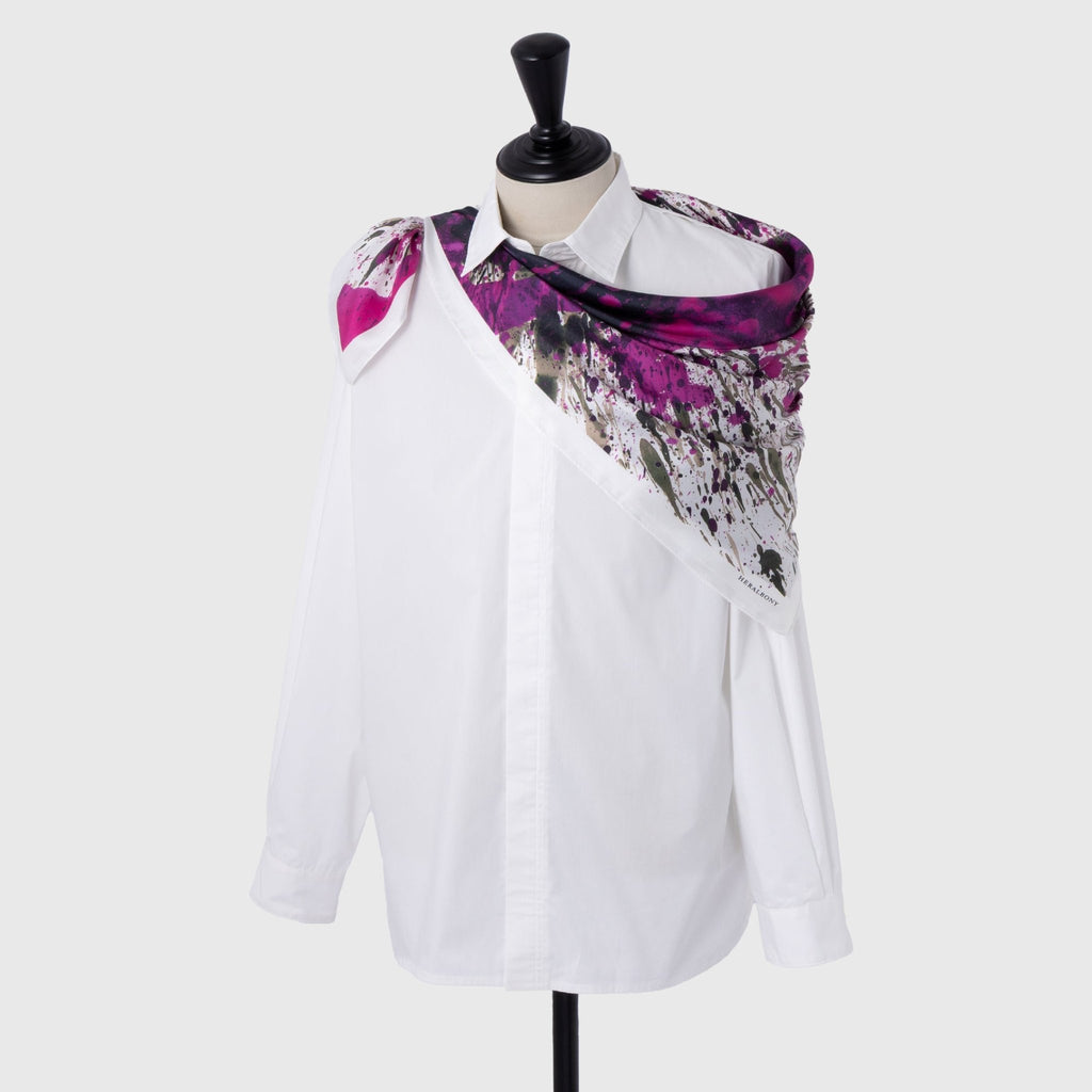 製造工程から見直しを図り、「表も裏も美しい」スカーフに仕上がりました。作品のエネルギーを失うことなく再現するため、シルク素材100%にこだわり、ハリのあるなめらかな肌触りで、首に巻いたときの心地よさも特徴です。