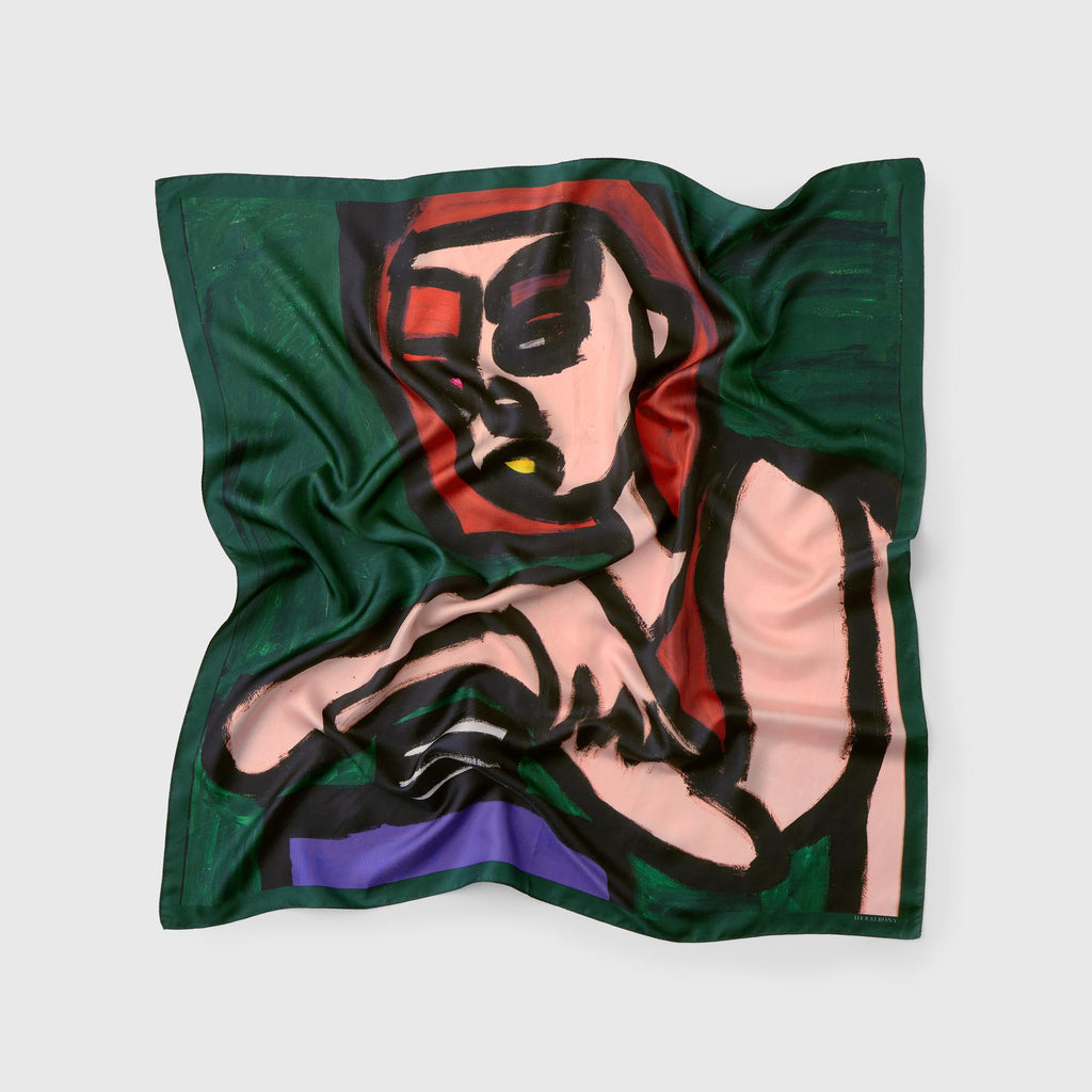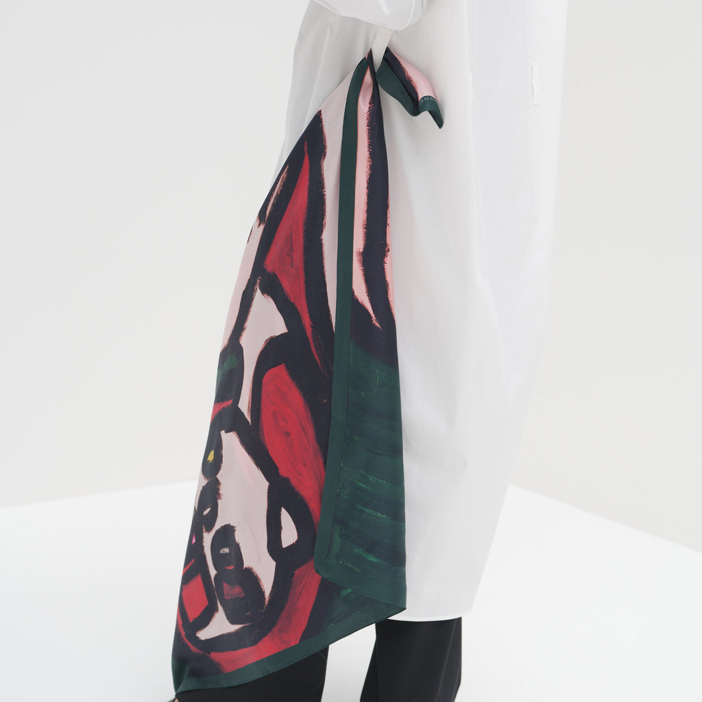 製造工程から見直しを図り、「表も裏も美しい」スカーフに仕上がりました。作品のエネルギーを失うことなく再現するため、シルク素材100%にこだわり、ハリのあるなめらかな肌触りで、首に巻いたときの心地よさも特徴です。