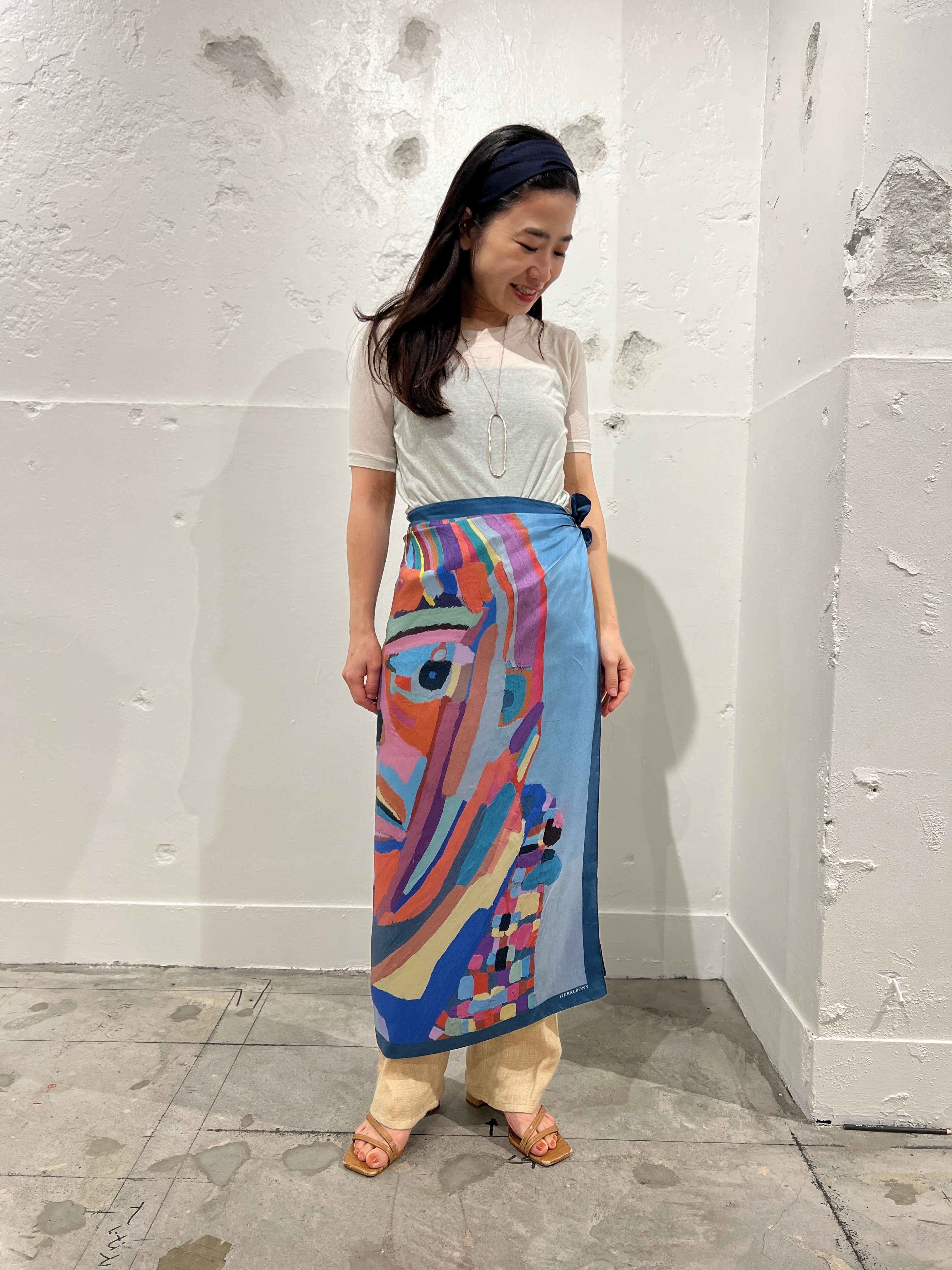 製造工程から見直しを図り、「表も裏も美しい」スカーフに仕上がりました。作品のエネルギーを失うことなく再現するため、シルク素材100%にこだわり、ハリのあるなめらかな肌触りで、首に巻いたときの心地よさも特徴です。