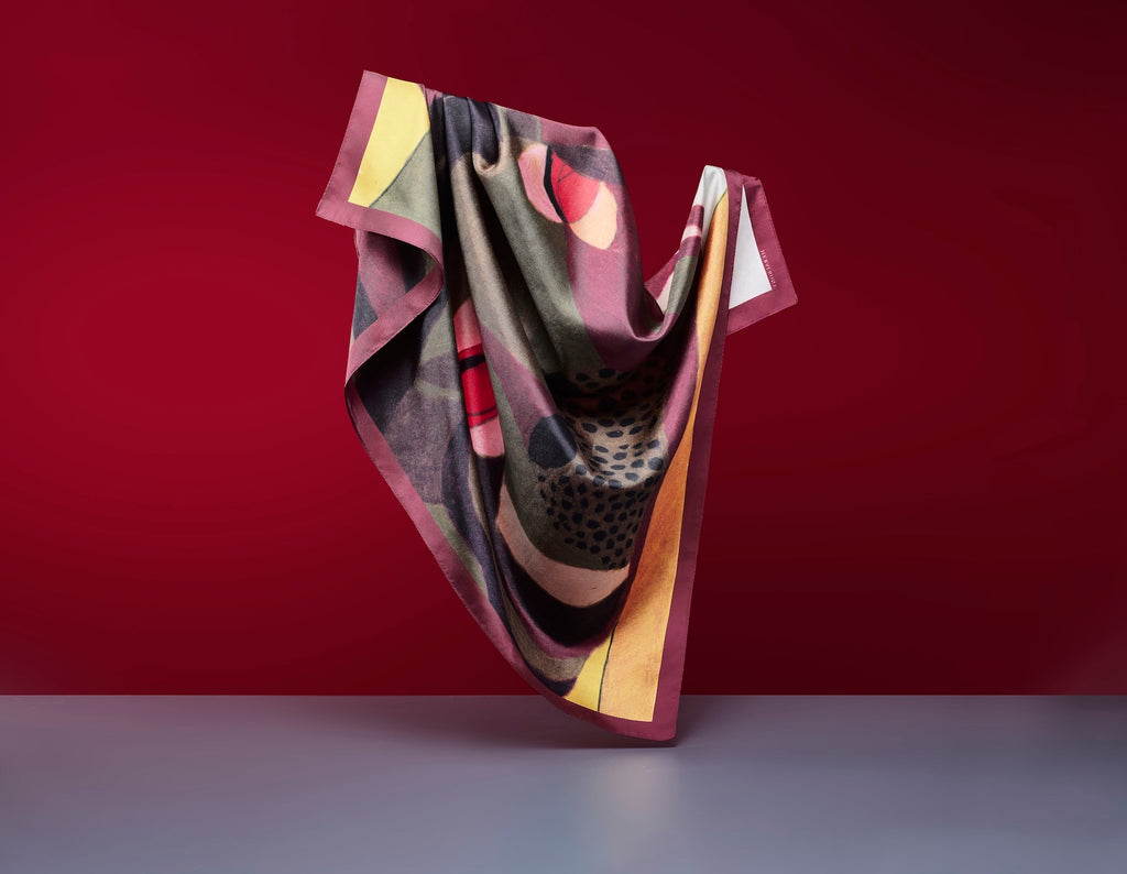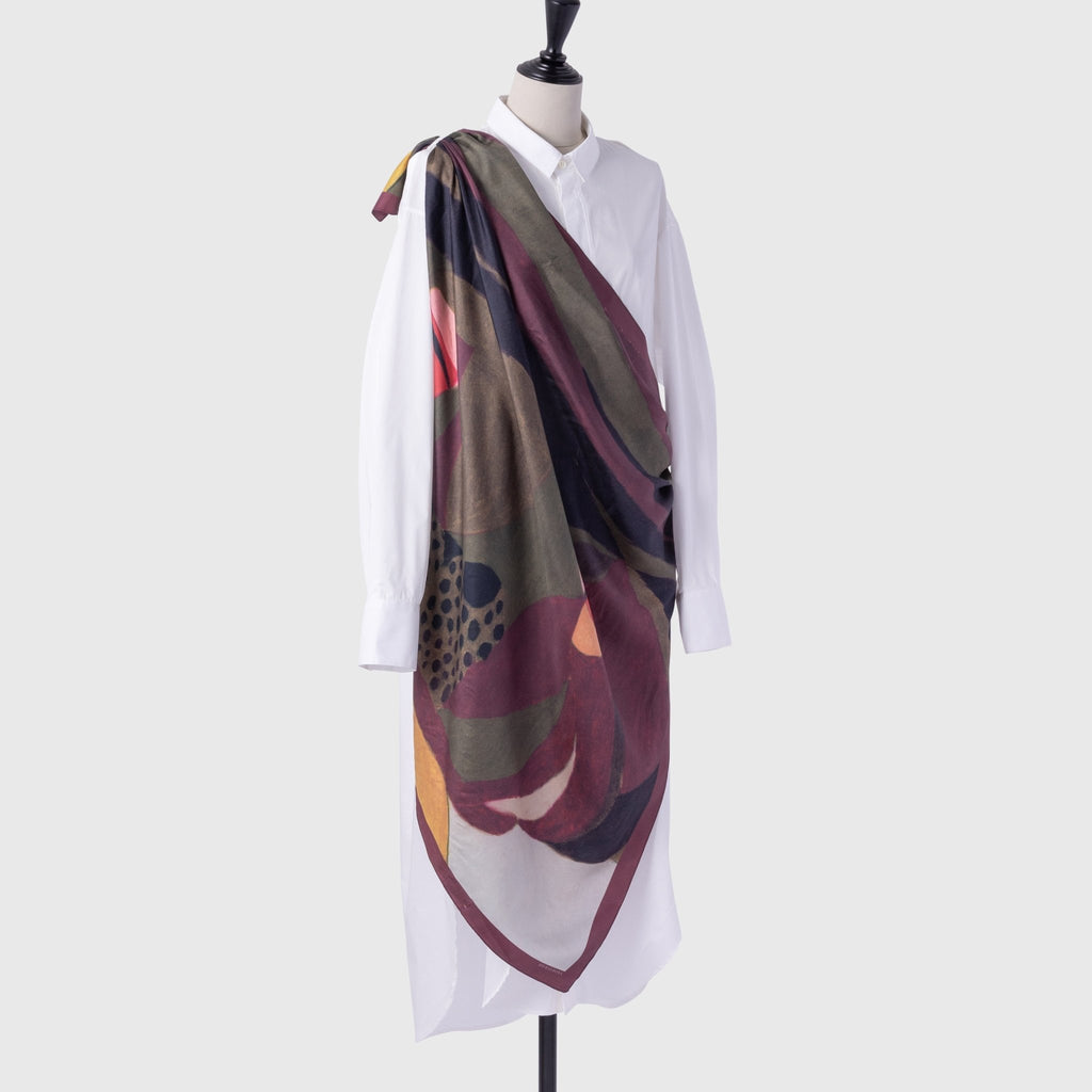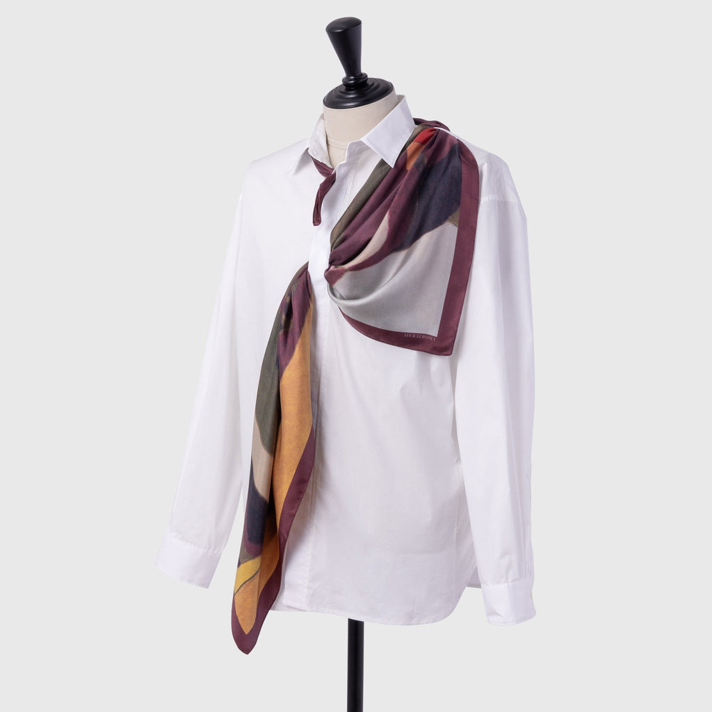 製造工程から見直しを図り、「表も裏も美しい」スカーフに仕上がりました。作品のエネルギーを失うことなく再現するため、シルク素材100%にこだわり、ハリのあるなめらかな肌触りで、首に巻いたときの心地よさも特徴です。