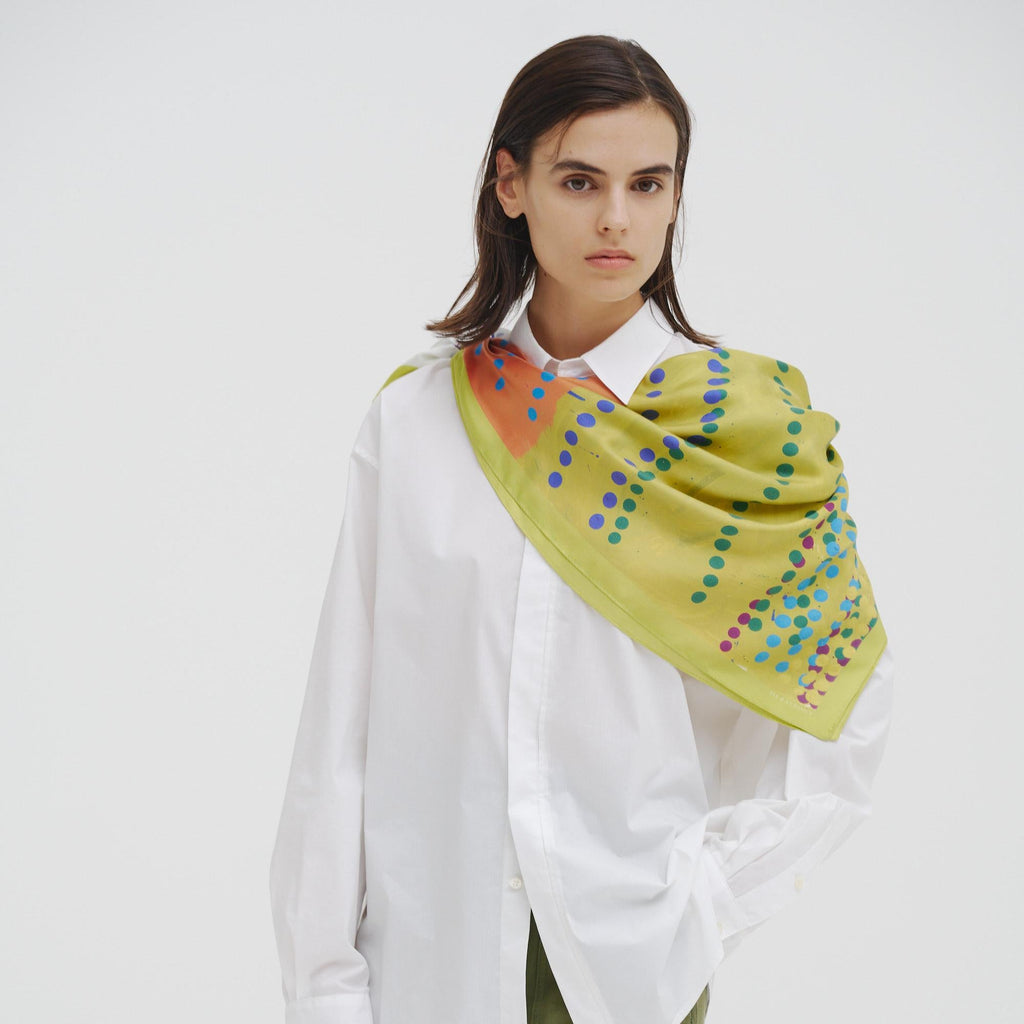 製造工程から見直しを図り、「表も裏も美しい」スカーフに仕上がりました。作品のエネルギーを失うことなく再現するため、シルク素材100%にこだわり、ハリのあるなめらかな肌触りで、首に巻いたときの心地よさも特徴です。