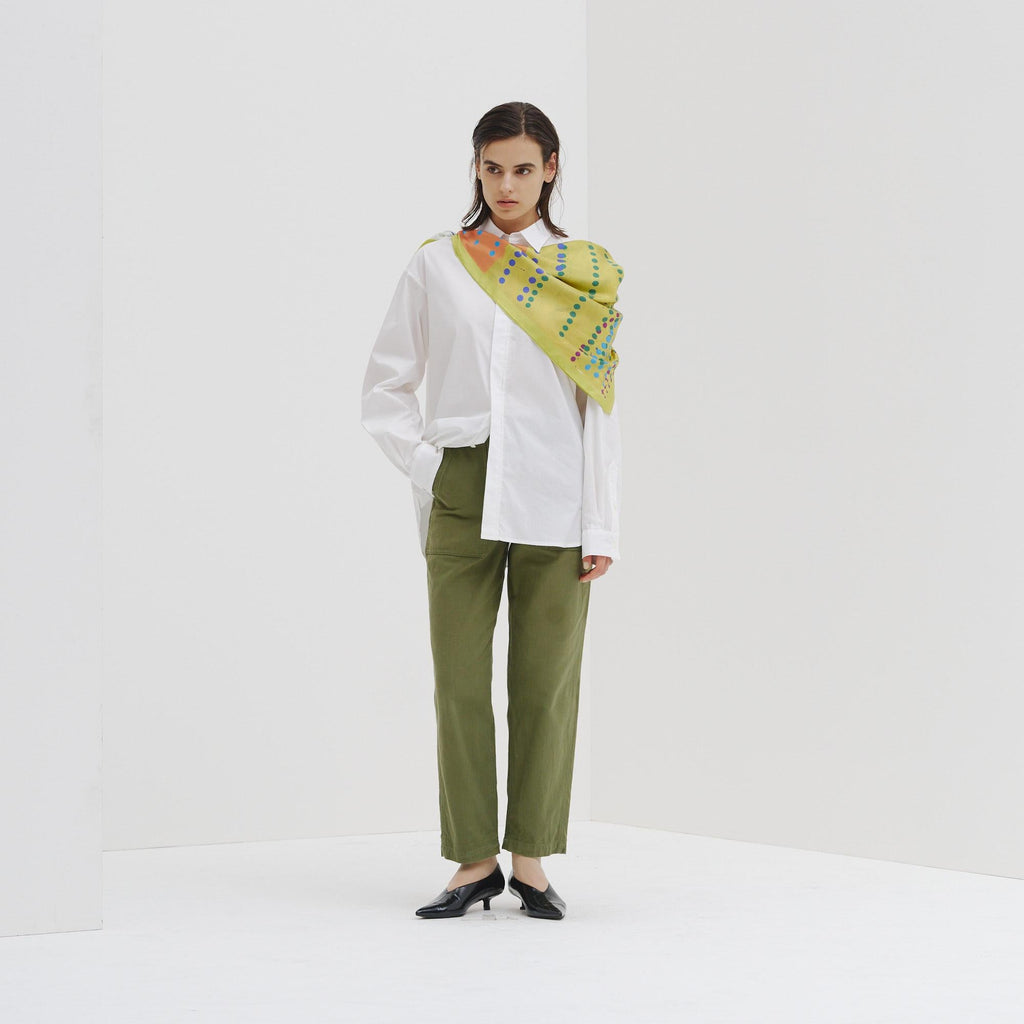 異彩を放つ作家の筆使いを忠実に再現するため、シルク素材100%にこだわりました。ずっと触っていたくなるようなハリのあるなめらかな手触りで、いつもの装いに特別な彩りを添えてくれます。