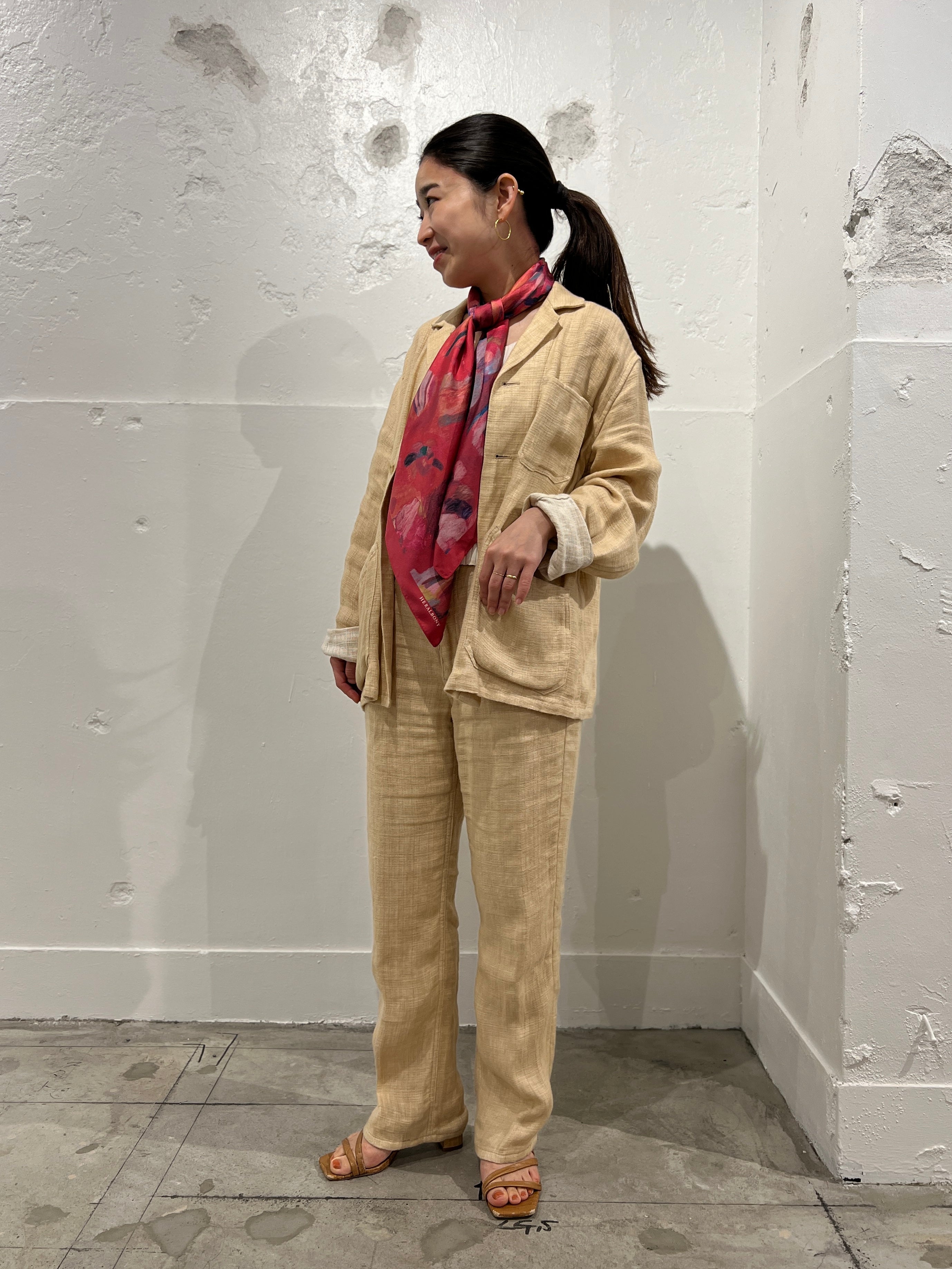 異彩を放つ作家の筆使いを忠実に再現するため、シルク素材100%にこだわりました。ずっと触っていたくなるようなハリのあるなめらかな手触りで、いつもの装いに特別な彩りを添えてくれます。