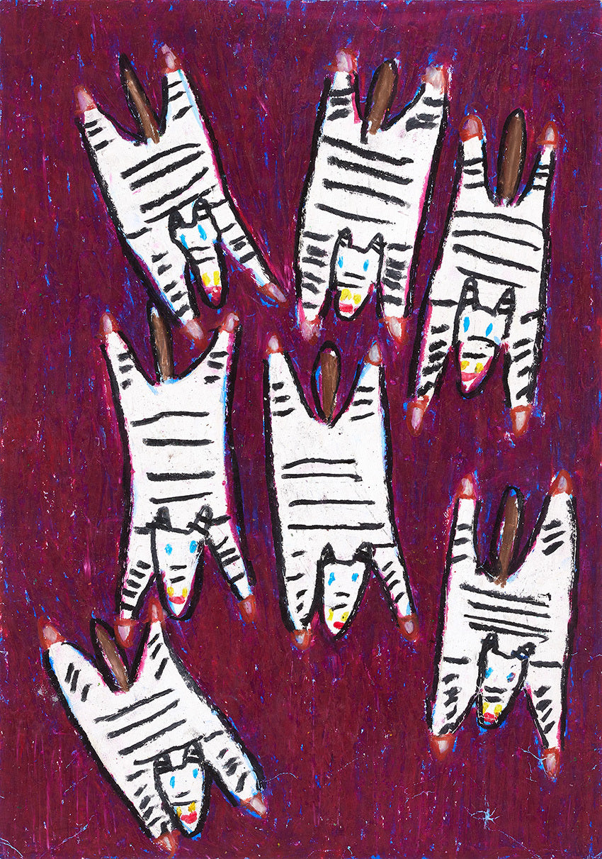 陶芸を始めた頃は、平面的な作品だった。 立体的な作品を作るきっかけになったのは、彼女の描いたダルマを、職員が球を二つ重ねて見せたことだった。 作品が立体的になったことで、 小さい作品でものびやかさが感じられ、かわいらしさがより生き生きと表現されるようになった。 職員との会話の中から生まれる 「お話シリーズ」 また「走っている」 「寝ている」 などの動作からイメージを起こして創作している。 また、絵にも本格的にチャレンジし、陶芸同様に彼女らしさを醸し出し、よりイメージを広げている。