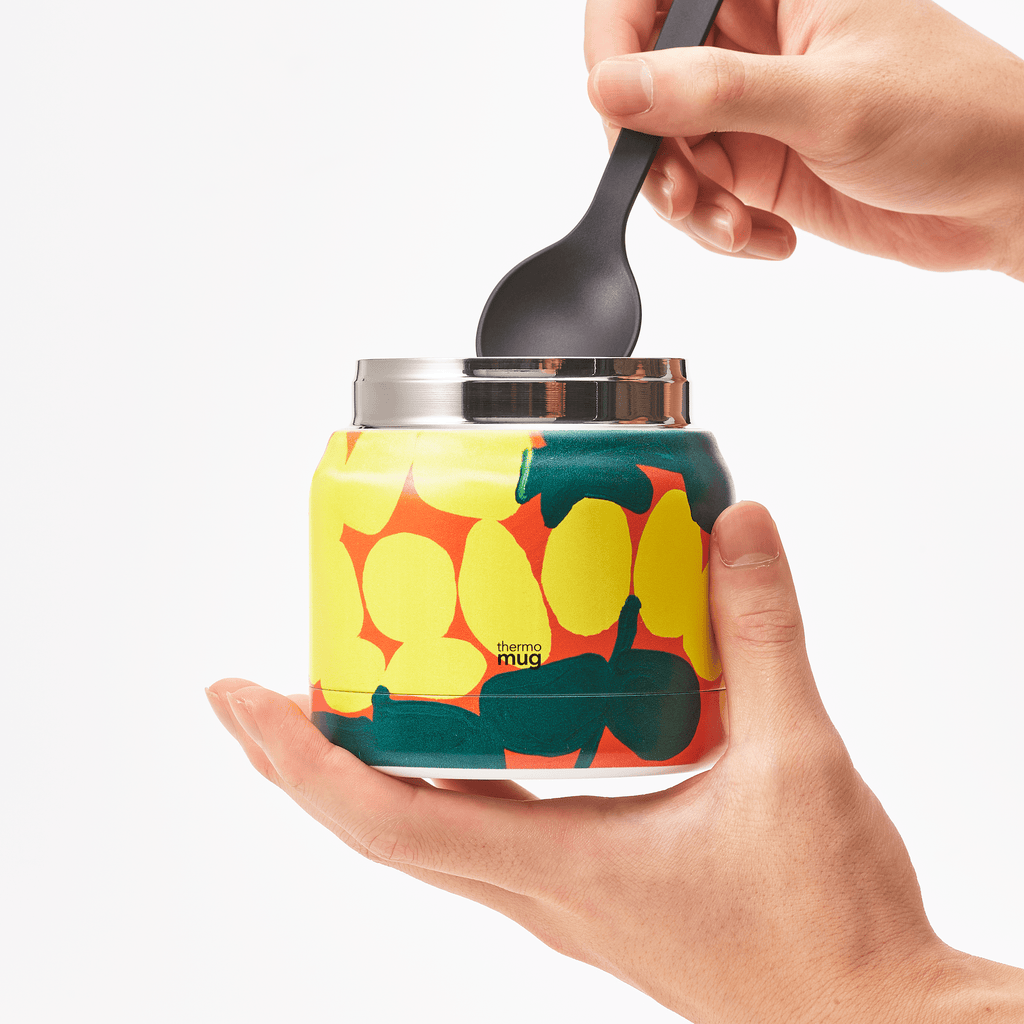 外出時のランチタイムに活躍するスープジャーです。丸みを帯びたシルエットが愛らしいサーモマグの「ミニタンク」にアートを口元までプリントしました。優れた保温・保冷機能を持ち、温かいスープやカレーはもちろん、冷たいデザートも持ち運べます。