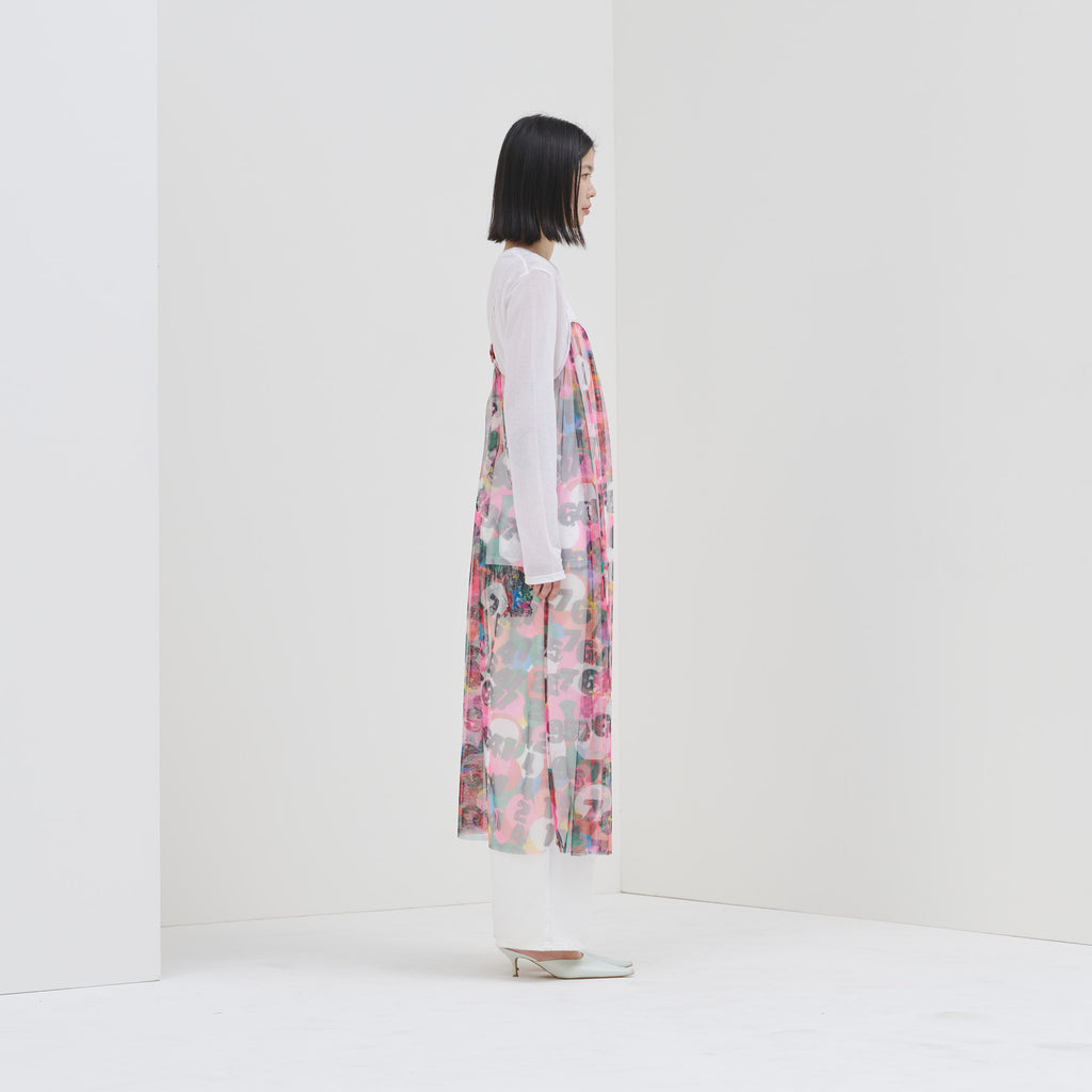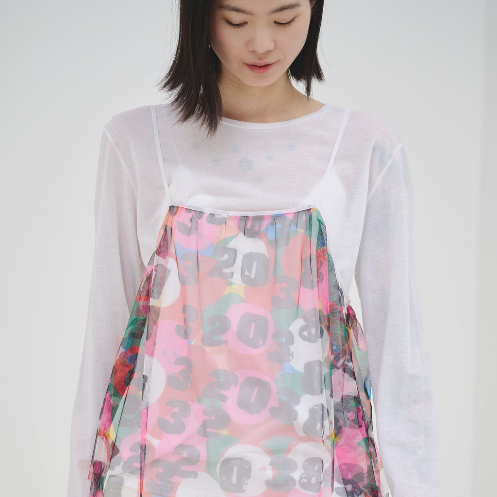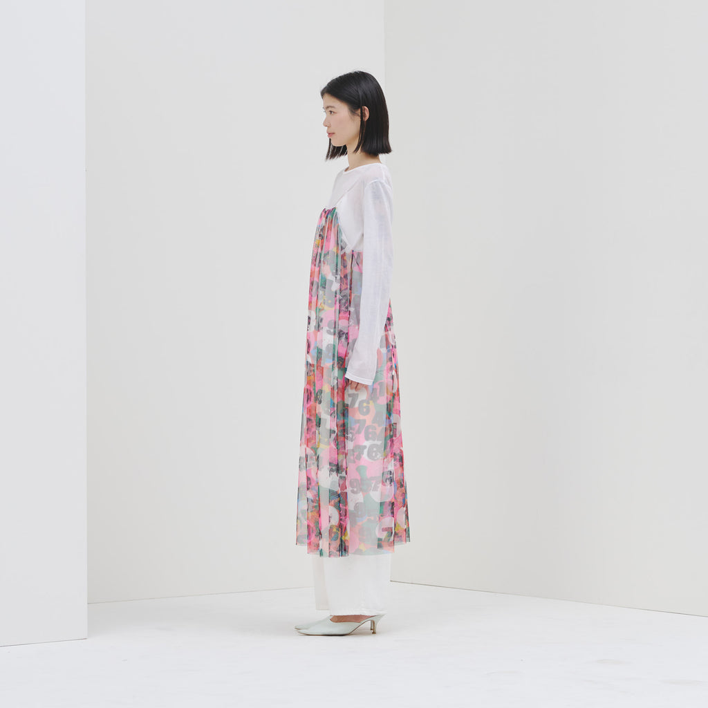 トレンドのチュール素材を、異彩のアートによって唯一無二の個性を持つアイテムに。しなやかなチュールを使用した、異彩のアートが透けるキャミソールワンピースです。レイヤードするアイテムによって様々な着こなしが楽しめます。生地をたっぷりと使用した前後のギャザーによって、ゆらめくアートもポイントです。
