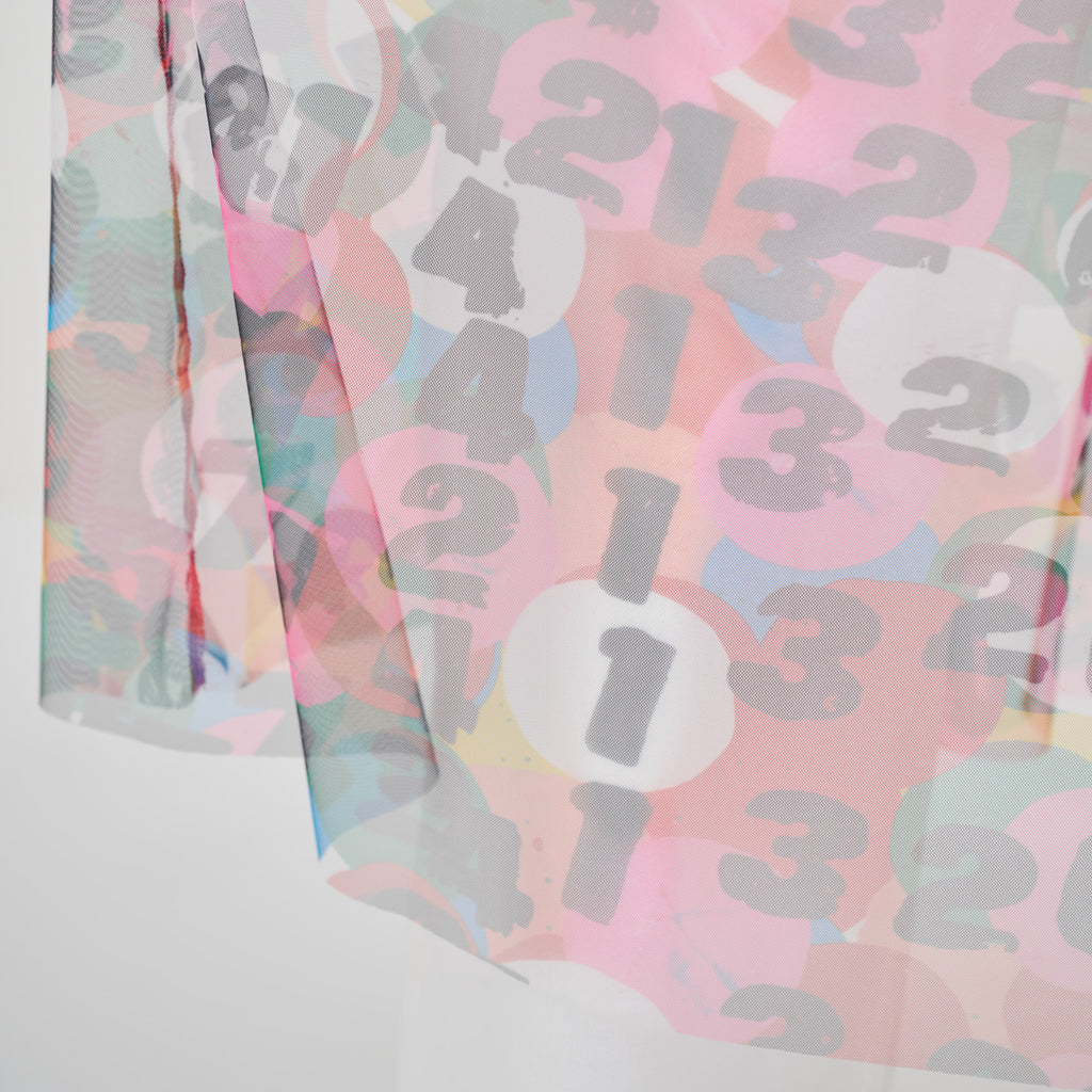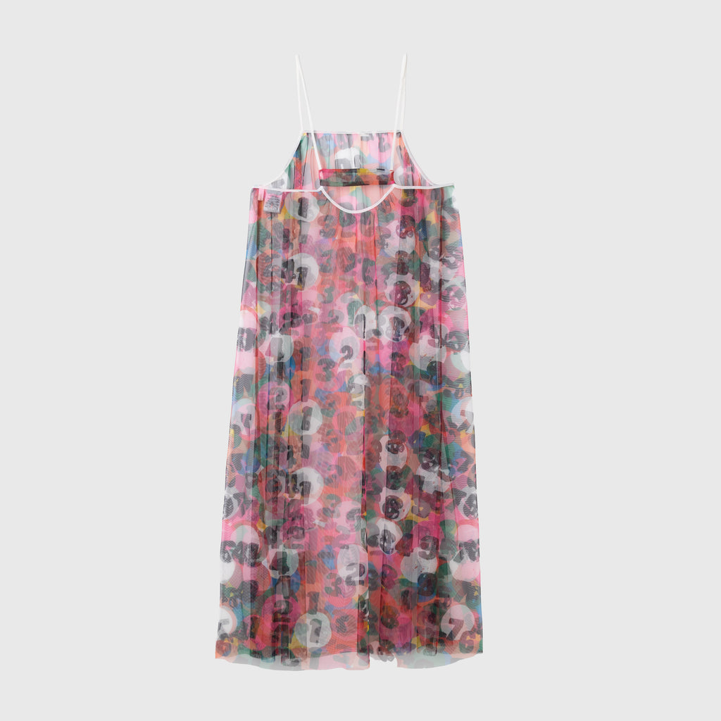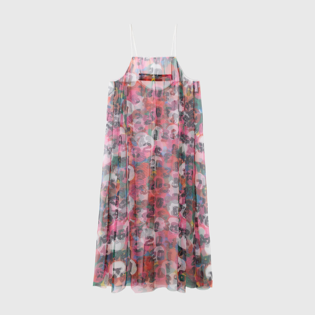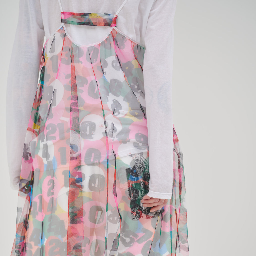 トレンドのチュール素材を、異彩のアートによって唯一無二の個性を持つアイテムに。しなやかなチュールを使用した、異彩のアートが透けるキャミソールワンピースです。レイヤードするアイテムによって様々な着こなしが楽しめます。生地をたっぷりと使用した前後のギャザーによって、ゆらめくアートもポイントです。