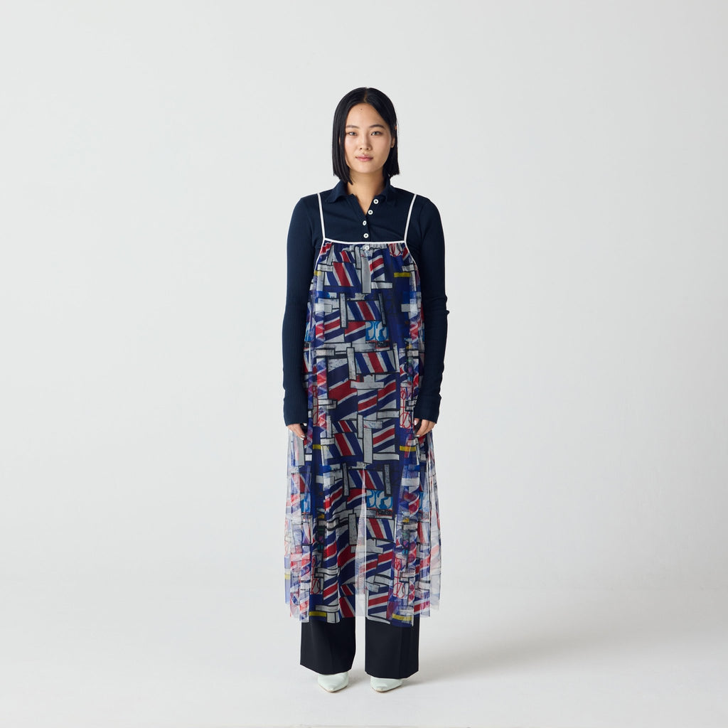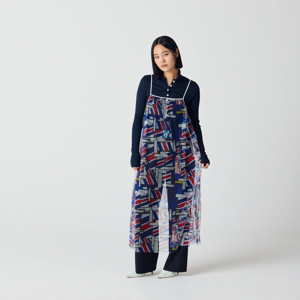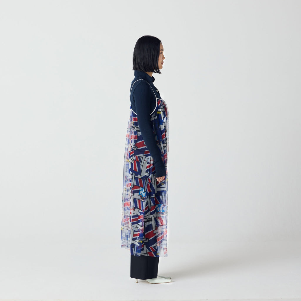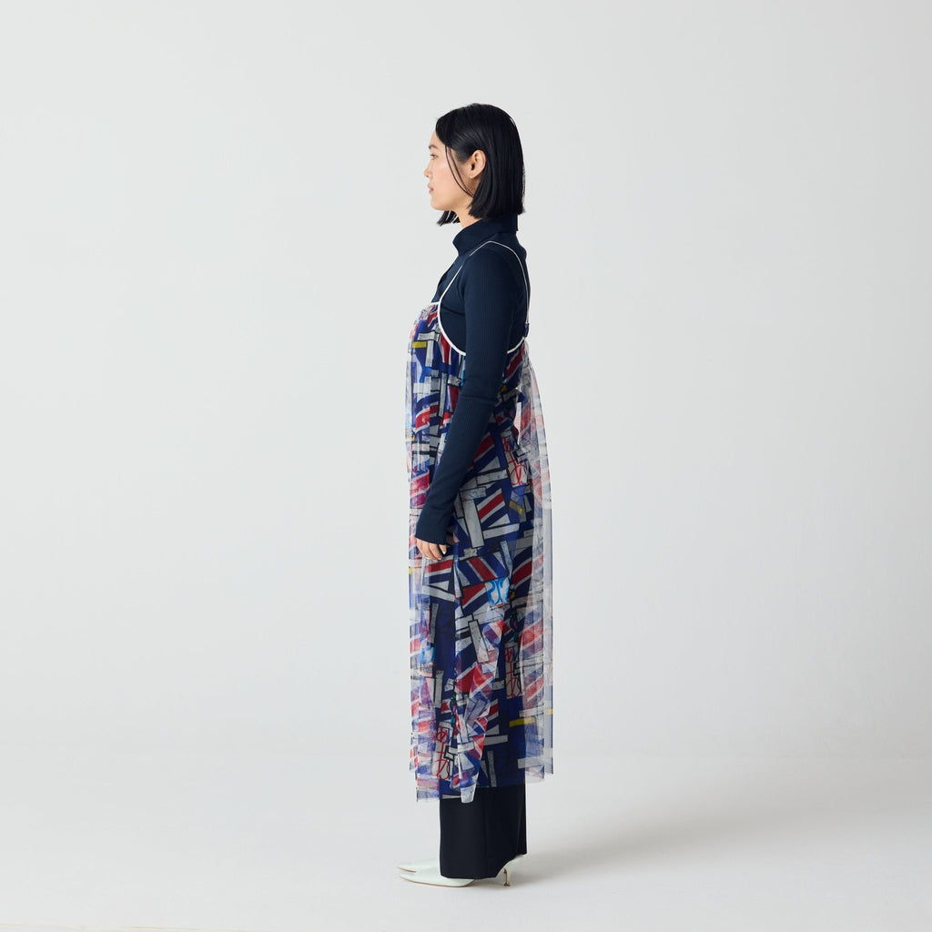 トレンドのチュール素材を、異彩のアートによって唯一無二の個性を持つアイテムに。しなやかなチュールを使用した、異彩のアートが透けるキャミソールワンピースです。