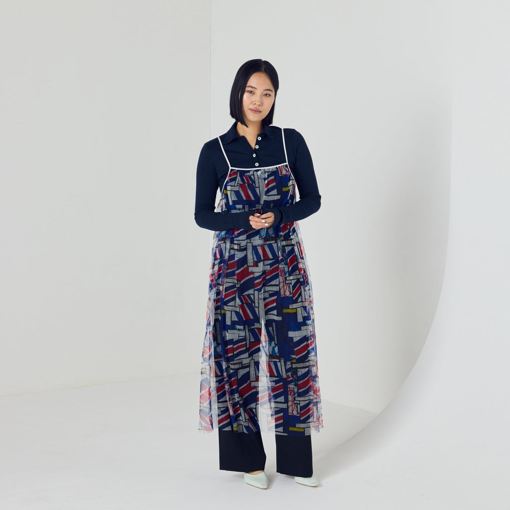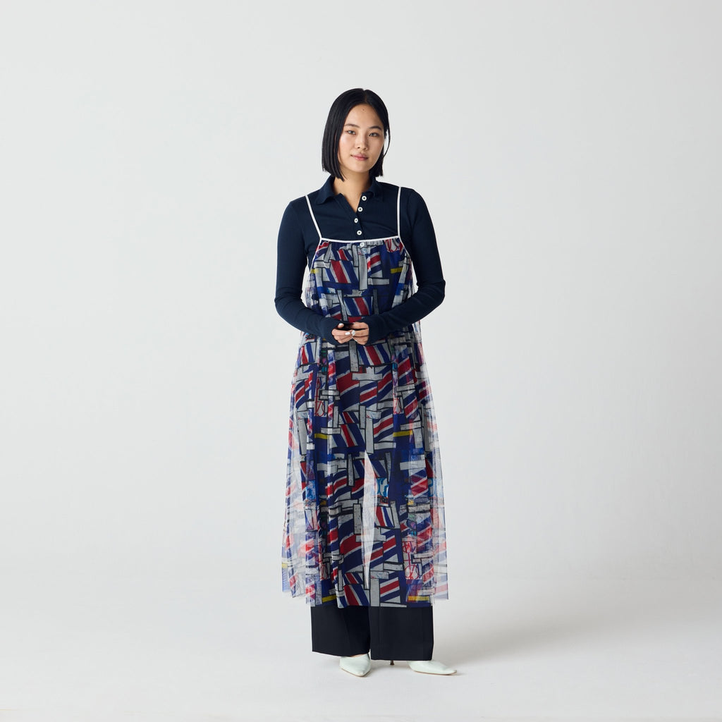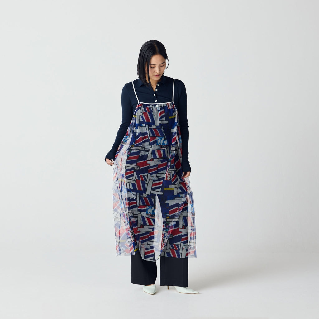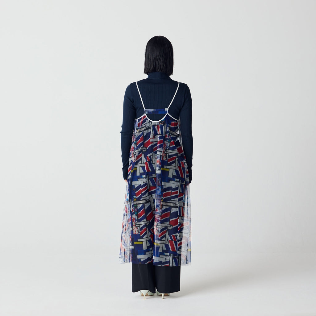 トレンドのチュール素材を、異彩のアートによって唯一無二の個性を持つアイテムに。しなやかなチュールを使用した、異彩のアートが透けるキャミソールワンピースです。