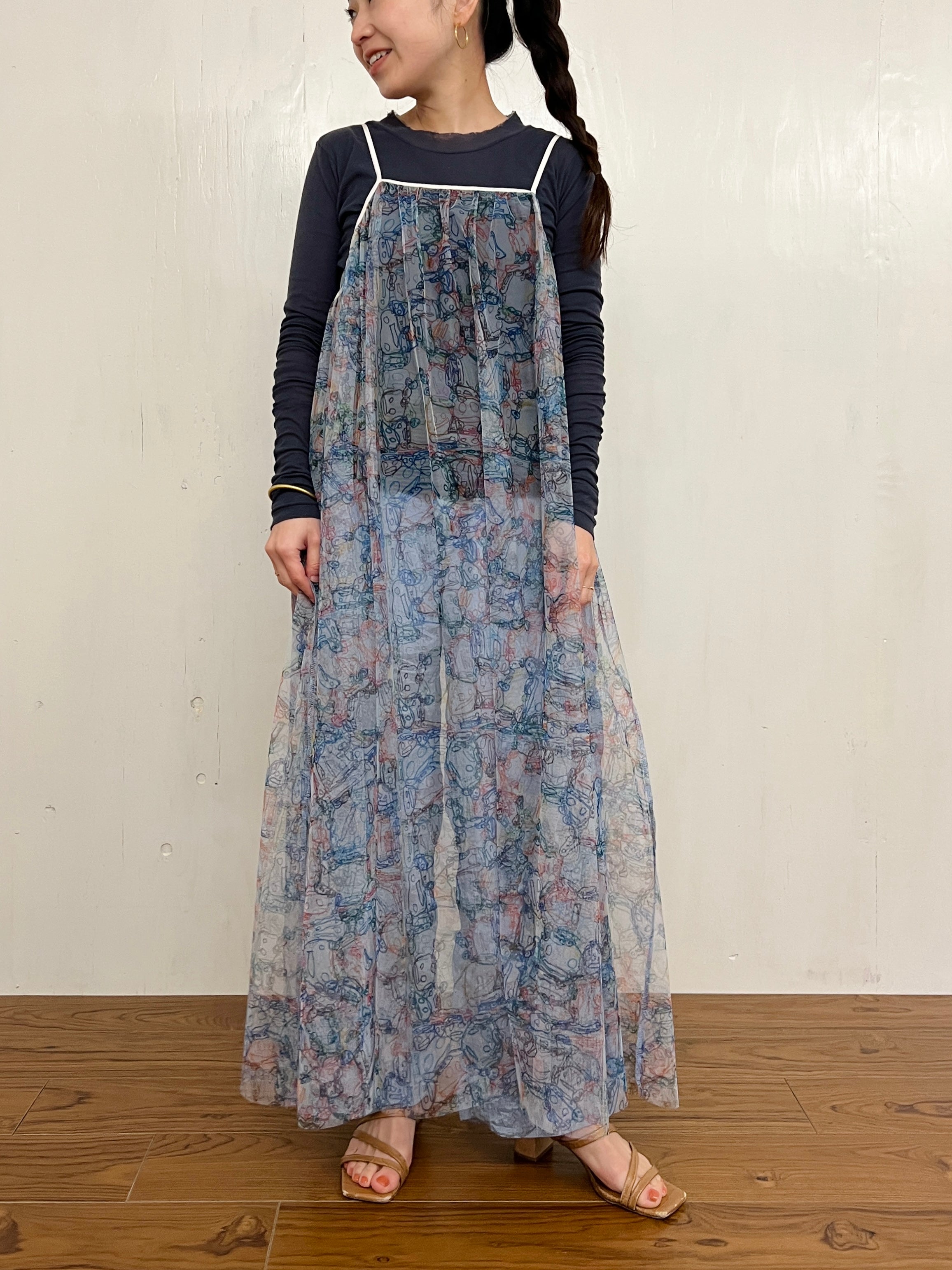 トレンドのチュール素材を、異彩のアートによって唯一無二の個性を持つアイテムに。しなやかなチュールを使用した、異彩のアートが透けるキャミソールワンピースです。レイヤードするアイテムによって様々な着こなしが楽しめます。生地をたっぷりと使用した前後のギャザーによって、ゆらめくアートもポイントです。