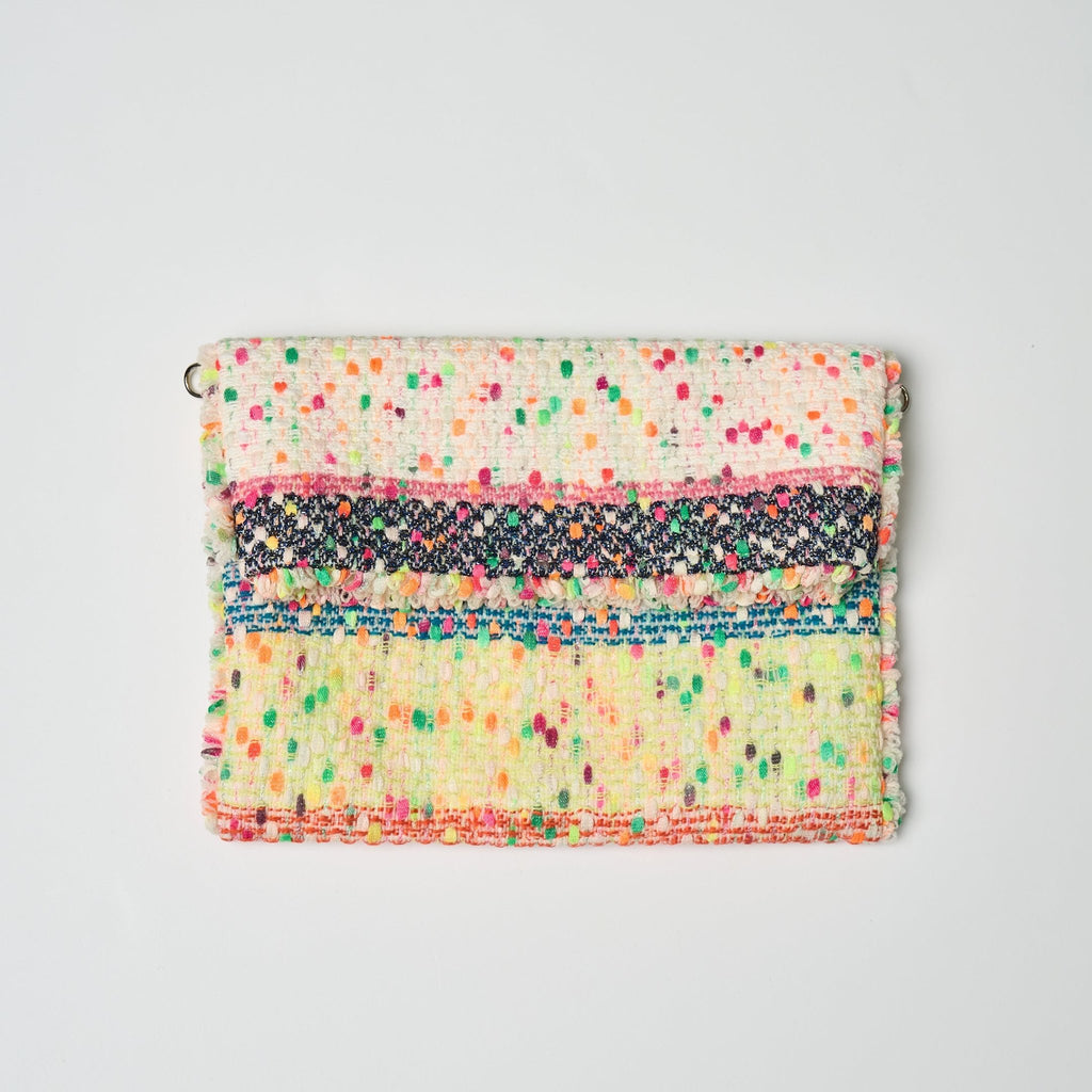 ルールや型に捉われない織の手法「さをり織」で作家・良子が織り上げた作品を再現したクラッチバッグ。異彩のテキスタイルに最大限のリスペクトと手間を重ね、世界の名だたるファッションブランドの製品化を手がける日本ホームスパンとともにつくりあげました。これまでにない奥行きを湛えたツイードが、いつもの装いに新たな可能性を与えます。