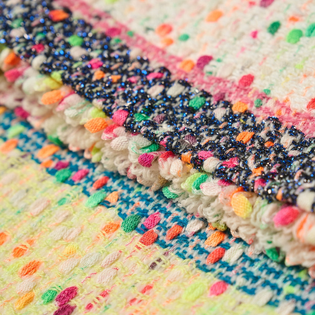 織り手が感性のままに織り重ねていく「さをり織」。その型にとらわれない異彩を職人の手によって昇華しました。作家と職人が何度も対話を重ねていくことで、異なる二者の表現が交差する奇跡のようなツイード生地が誕生しました。