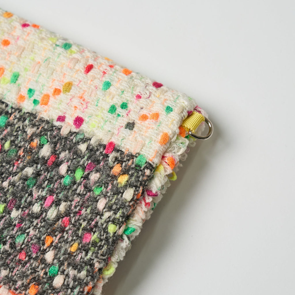 もくもくと織り機に向かう作家の時間の重なりすら感じられるツイードが、オケージョンから日常まで装いに深みを与えます。クラッチバッグの両端にはDカンつきで、ショルダーストラップやリストレットを取り付けることができます。