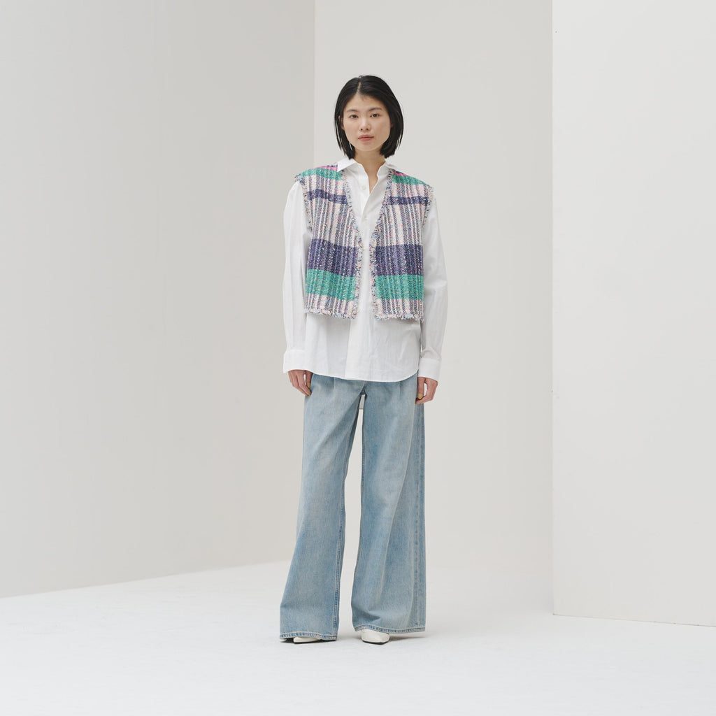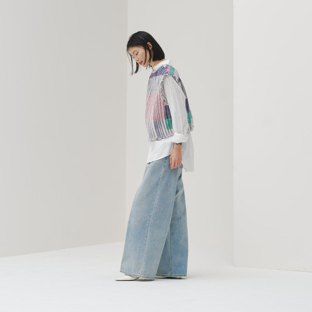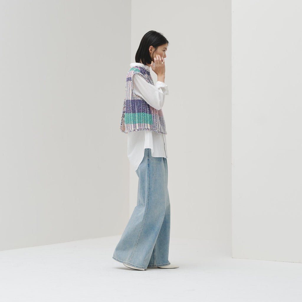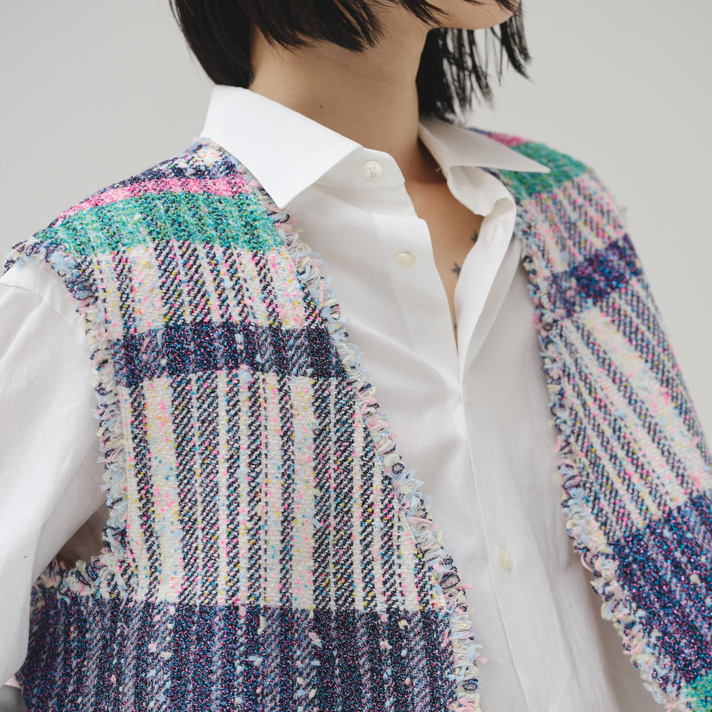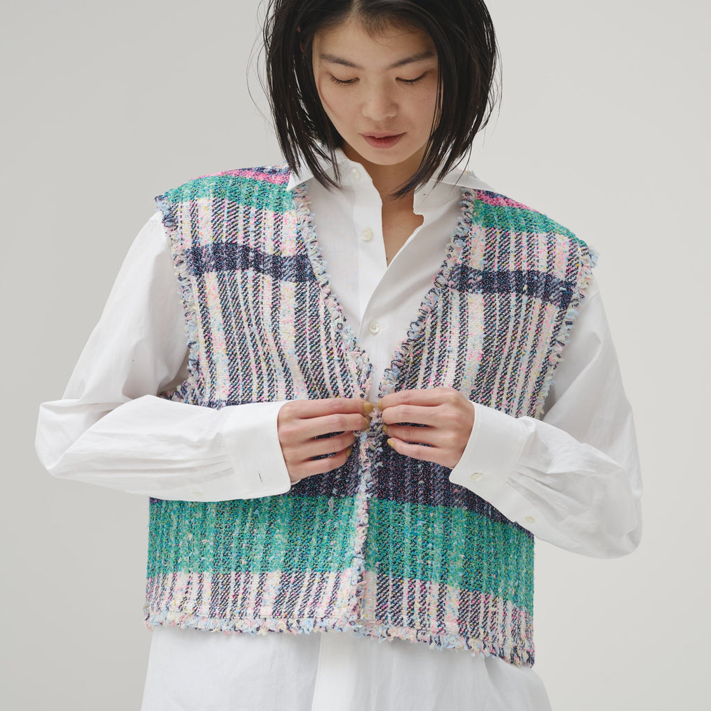 作家・良子が「さをり織」で紡ぐテキスタイルを忠実に再現した希少なツイードジレ。作家自身が糸から選び織り上げた作品を、名だたるブランドのツイード生地を手がける日本ホームスパンとともに異彩を放つ一着へと昇華しました。前後2way仕様で、2通りの着こなしを楽しむことができます。
