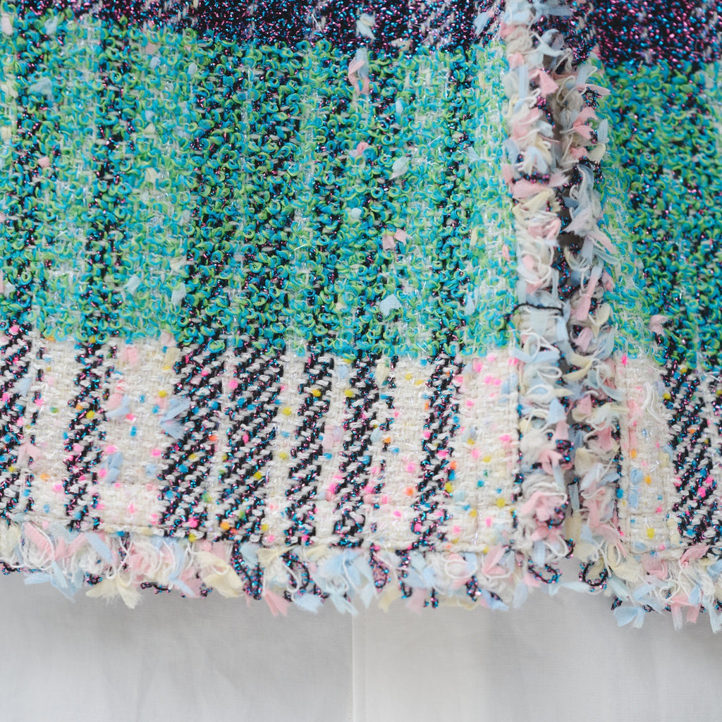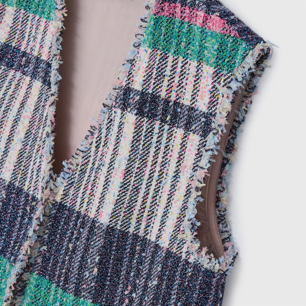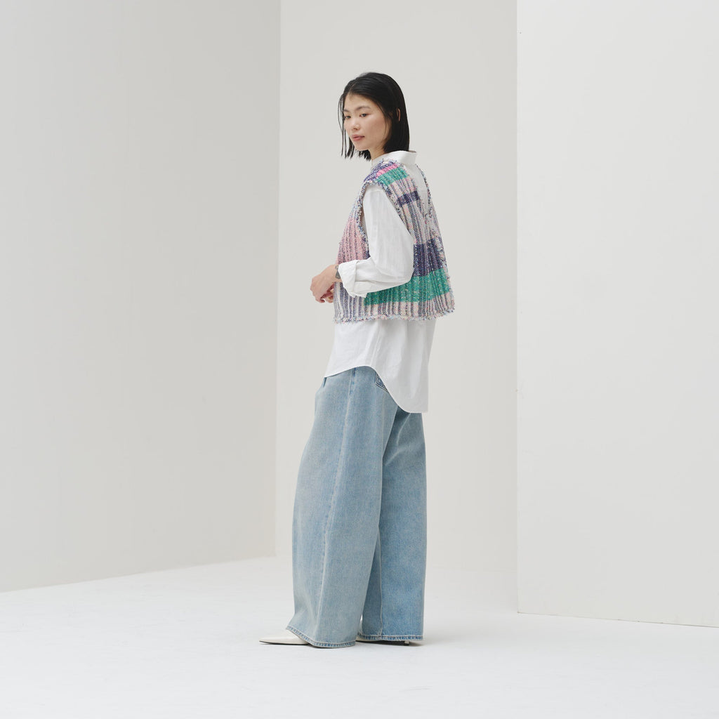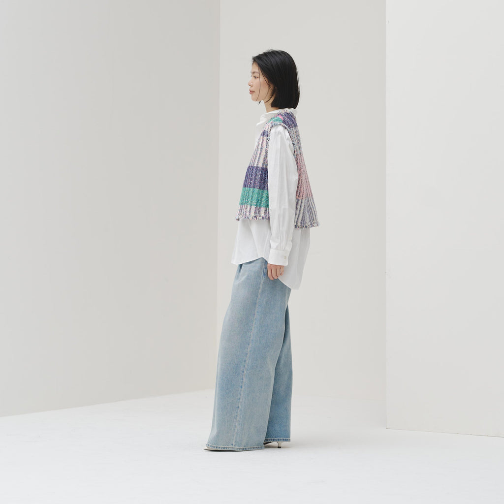 作家・良子が「さをり織」で紡ぐテキスタイルを忠実に再現した希少なツイードジレ。作家自身が糸から選び織り上げた作品を、名だたるブランドのツイード生地を手がける日本ホームスパンとともに異彩を放つ一着へと昇華しました。前後2way仕様で、2通りの着こなしを楽しむことができます。