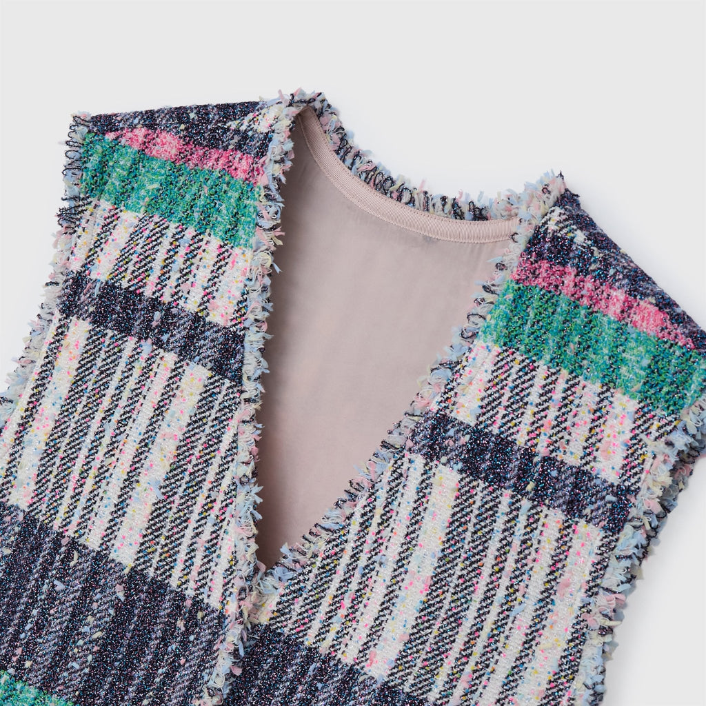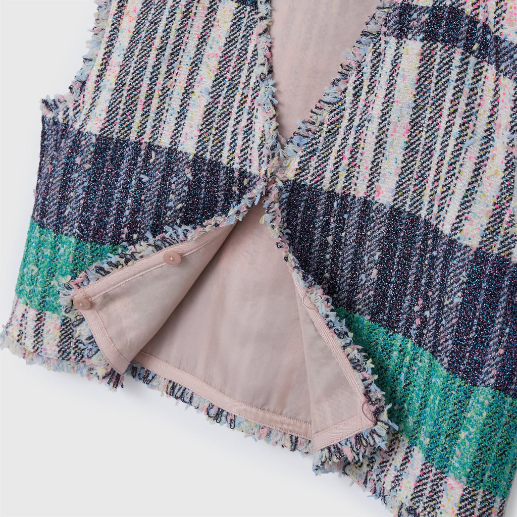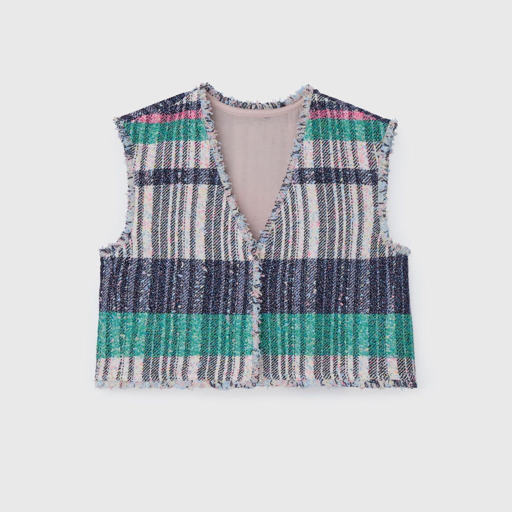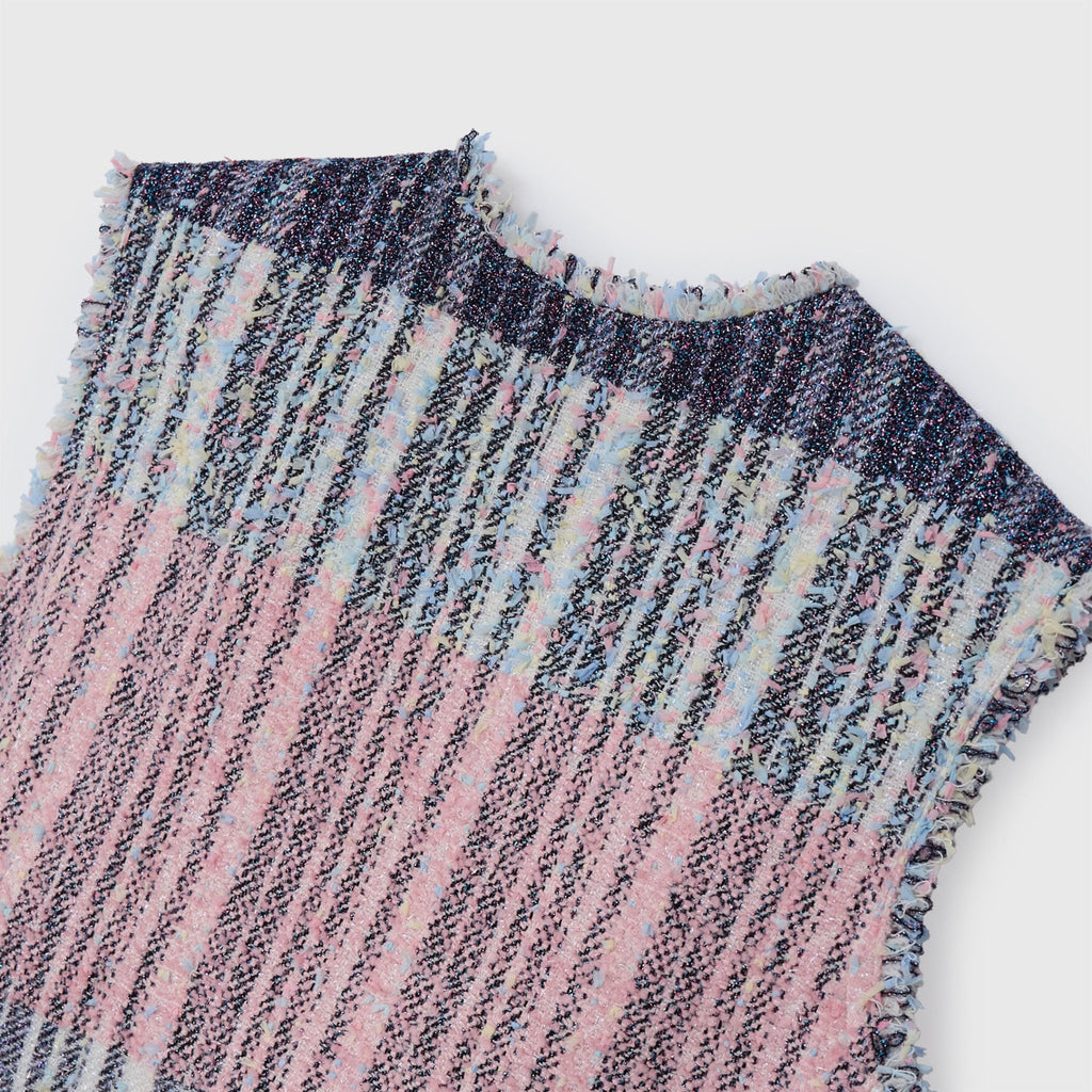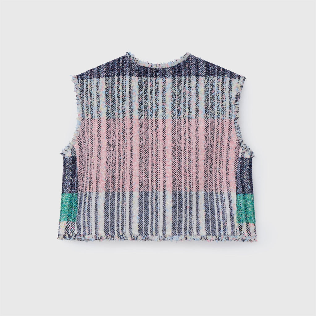作家・良子が「さをり織」で紡ぐテキスタイルを忠実に再現した希少なツイードジレ。作家自身が糸から選び織り上げた作品を、名だたるブランドのツイード生地を手がける日本ホームスパンとともに異彩を放つ一着へと昇華しました。前後2way仕様で、2通りの着こなしを楽しむことができます。