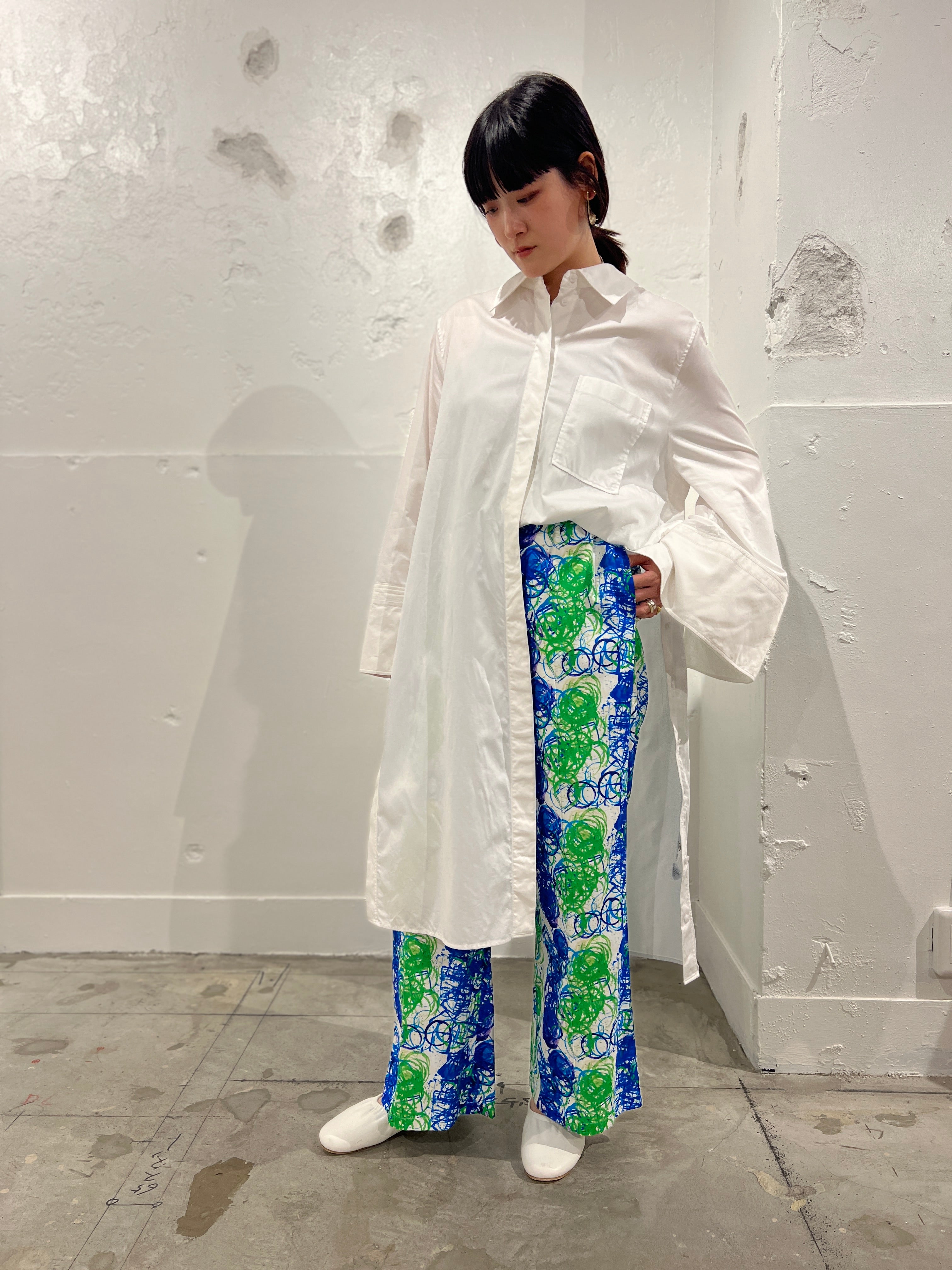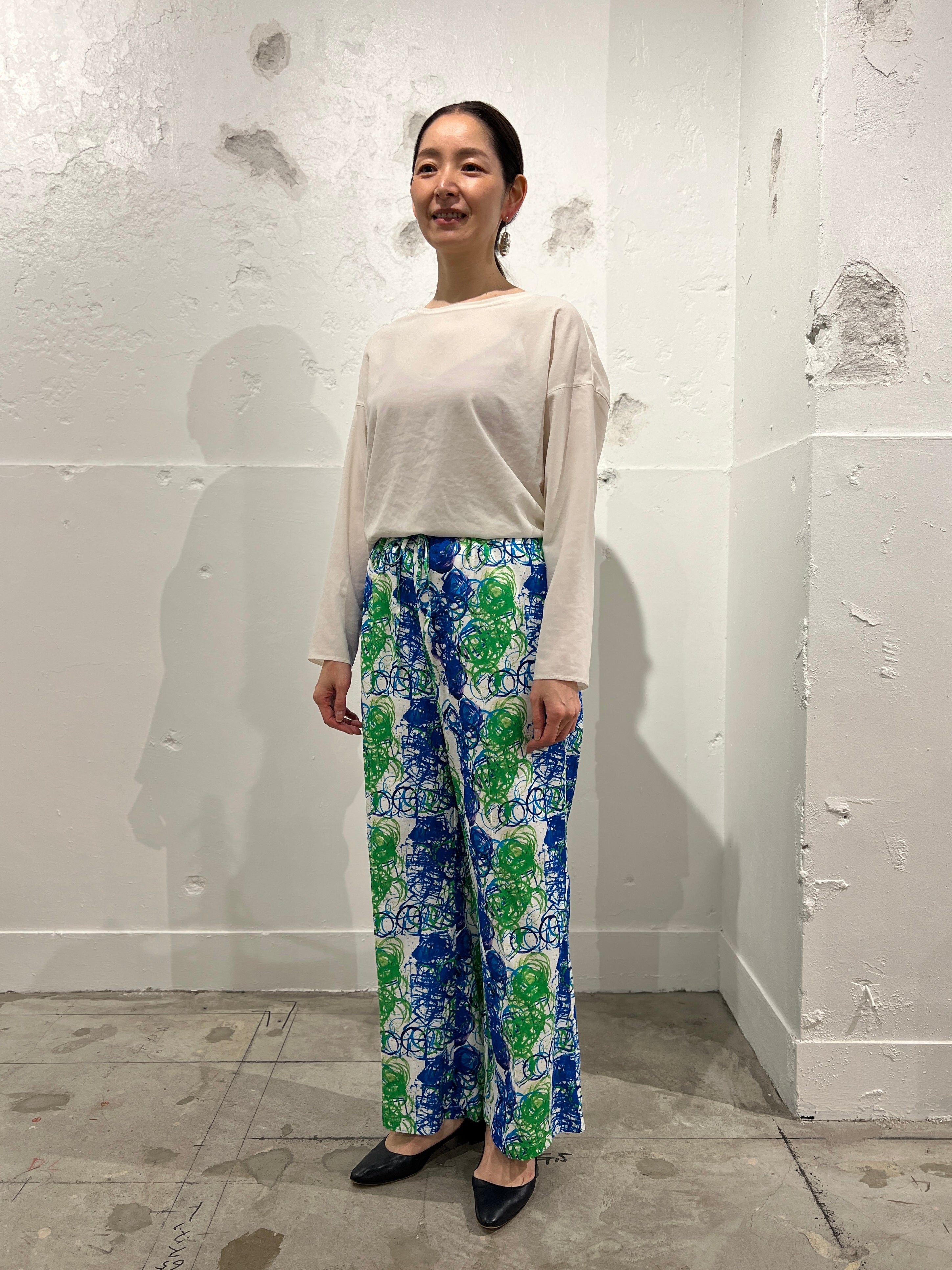 ビビッドカラーのアートが夏らしい雰囲気を盛り上げるイージーパンツ。ウエストはゴム入りで、リボンでサイズを調整できます。すとんと落ちるようなシルエットの美しさにこだわり、ジャケットやシャツとも合わせやすいデザインに仕上げました。